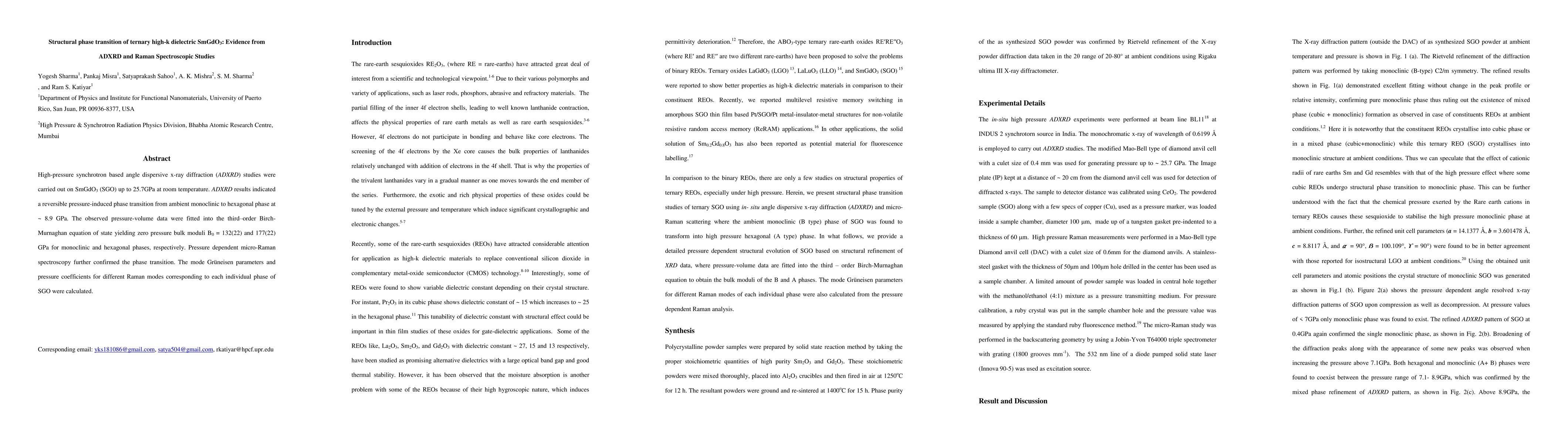 This study investigates the structural phase transition in SmGdO3 under high pressure using ADXRD and Raman spectroscopy, revealing a reversible transition from monoclinic to hexagonal phase at 8.9 GPa. The bulk moduli for both phases were calculated, and Raman spectroscopy confirmed the phase transition and provided mode Gruneisen parameters.