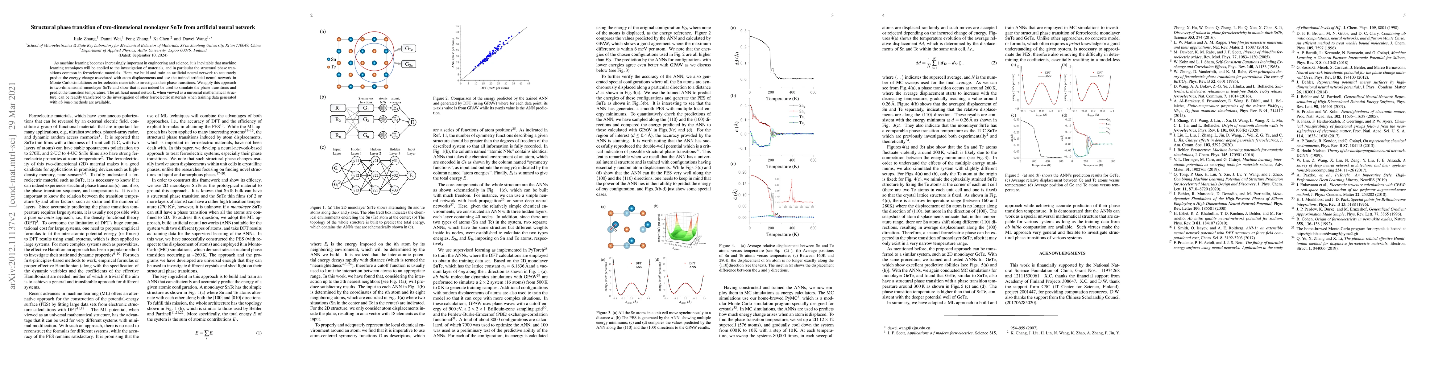 This paper utilizes an artificial neural network to predict the energy changes in two-dimensional monolayer SnTe during structural phase transitions, demonstrating its effectiveness in simulating phase transitions and predicting transition temperatures. The approach can be extended to other ferroelectric materials with appropriate training data.