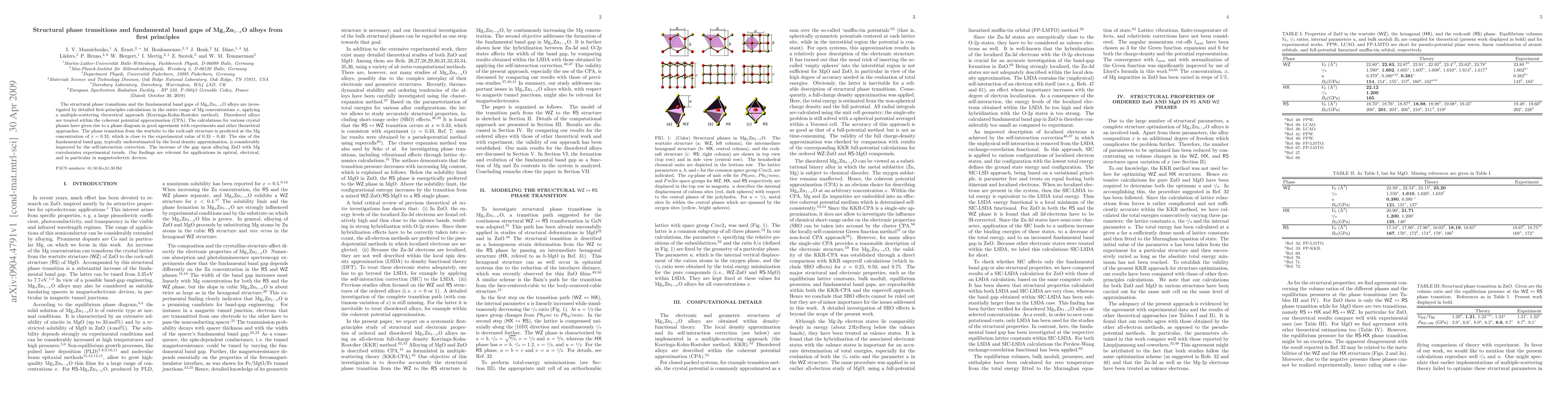 The structural phase transitions and the fundamental band gaps of Mg(x)Zn(1-x)O alloys are investigated by detailed first-principles calculations in the entire range of Mg concentrations x, applying a multiple-scattering theoretical approach (Korringa-Kohn-Rostoker method). Disordered alloys are treated within the coherent potential approximation (CPA). The calculations for various crystal phases have given rise to a phase diagram in good agreement with experiments and other theoretical approaches. The phase transition from the wurtzite to the rock-salt structure is predicted at the Mg concentration of x = 0.33, which is close to the experimental value of 0.33 - 0.40. The size of the fundamental band gap, typically underestimated by the local density approximation, is considerably improved by the self-interaction correction. The increase of the gap upon alloying ZnO with Mg corroborates experimental trends. Our findings are relevant for applications in optical, electrical, and in particular in magnetoelectric devices.