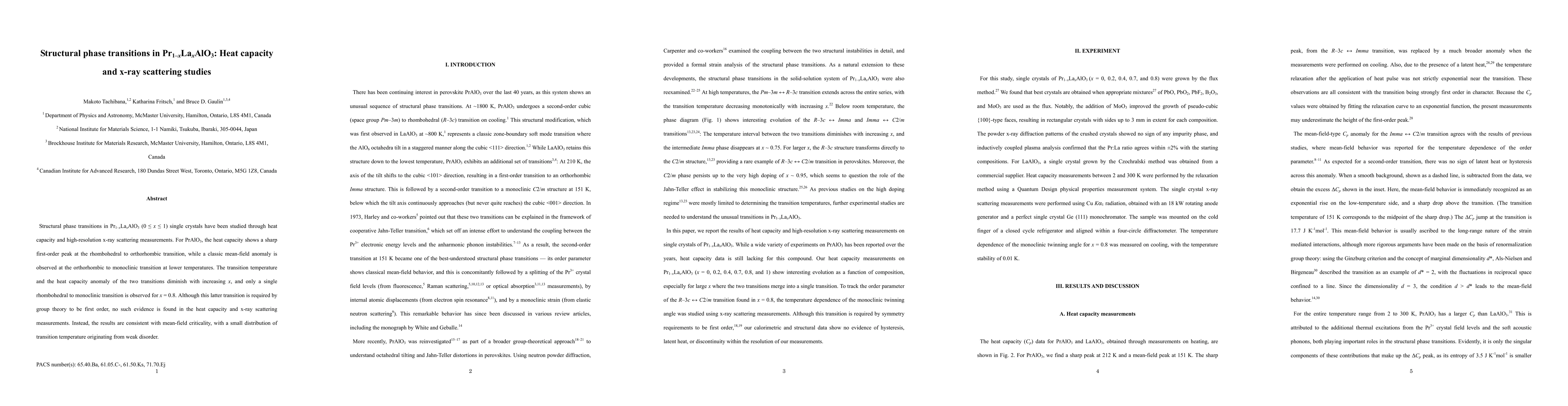 Structural phase transitions in Pr$_{1-x}$La$_x$AlO$_3$ (0 $\leq x\leq$ 1) single crystals have been studied through heat capacity and high-resolution x-ray scattering measurements. For PrAlO$_3$, the heat capacity shows a sharp first-order peak at the rhombohedral to orthorhombic transition, while a classical mean-field anomaly is observed at the orthorhombic to monoclinic transition at lower temperatures. The transition temperature and the heat capacity anomaly of the two transitions diminish with increasing $x$, and only a single rhombohedral to monoclinic transition is observed for $x = 0.8$. Although this latter transition is required by group theory to be first order, no such evidence is found in the heat capacity and x-ray scattering measurements. Instead, the results are consistent with mean-field criticality, with a small distribution of transition temperature originating from weak disorder.