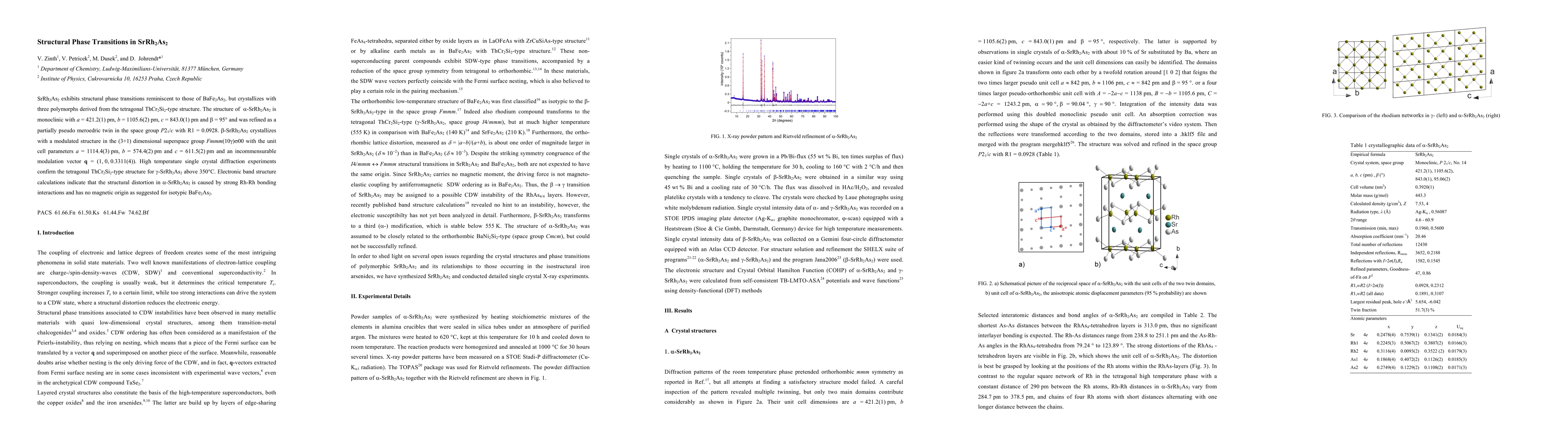 SrRh2As2 exhibits two structural phase transitions with three polymorphs, including a monoclinic and modulated structure, driven by Rh-Rh bonding interactions without magnetic origin.