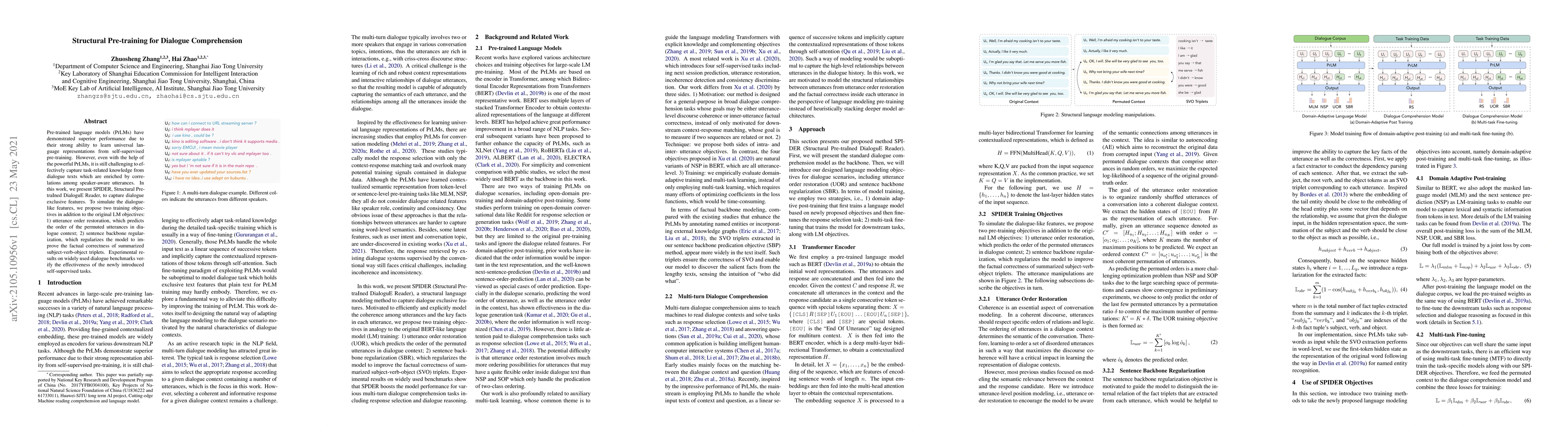 The paper introduces SPIDER, a Structural Pre-trained DialoguE Reader, designed to capture unique dialogue features using pre-trained language models. SPIDER employs additional self-supervised tasks—utterance order restoration and sentence backbone regularization—to enhance dialogue comprehension. Experimental results show improved performance on dialogue benchmarks.