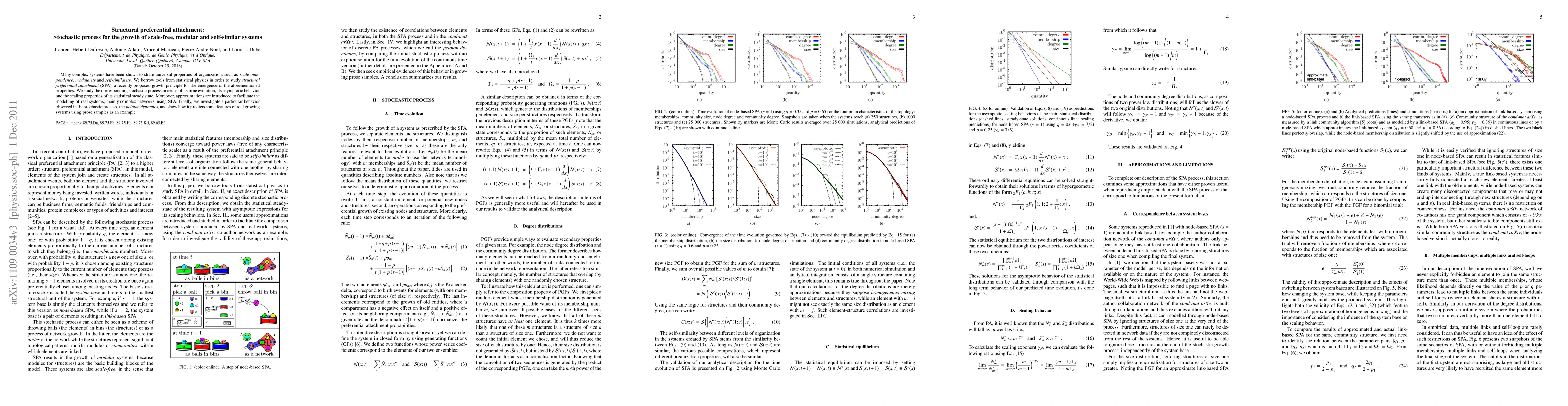 Many complex systems have been shown to share universal properties of organization, such as scale independence, modularity and self-similarity. We borrow tools from statistical physics in order to study structural preferential attachment (SPA), a recently proposed growth principle for the emergence of the aforementioned properties. We study the corresponding stochastic process in terms of its time evolution, its asymptotic behavior and the scaling properties of its statistical steady state. Moreover, approximations are introduced to facilitate the modelling of real systems, mainly complex networks, using SPA. Finally, we investigate a particular behavior observed in the stochastic process, the peloton dynamics, and show how it predicts some features of real growing systems using prose samples as an example.