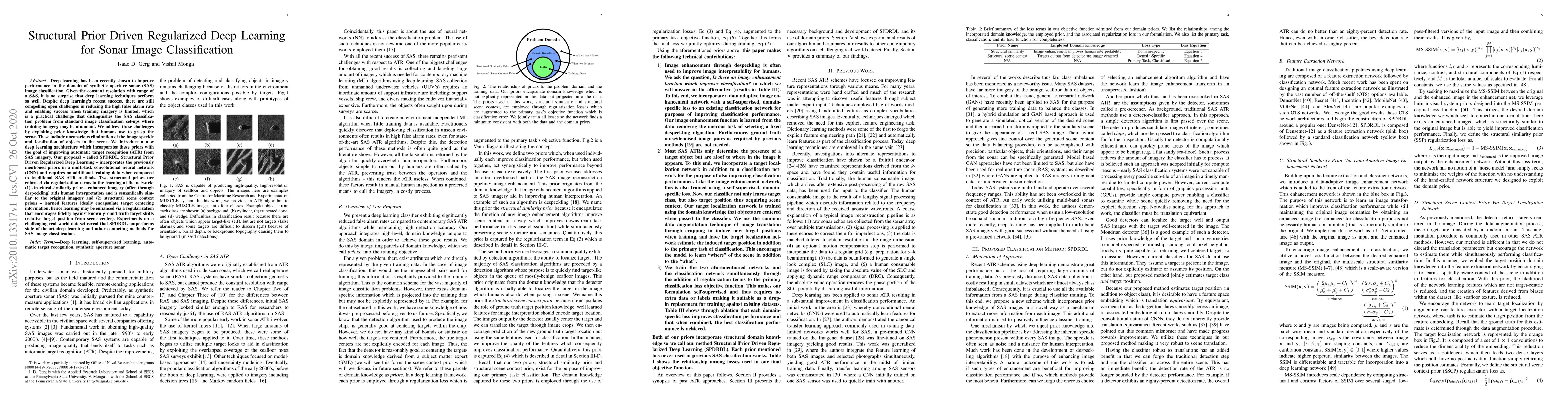 Deep learning has been recently shown to improve performance in the domain of synthetic aperture sonar (SAS) image classification. Given the constant resolution with range of a SAS, it is no surprise that deep learning techniques perform so well. Despite deep learning's recent success, there are still compelling open challenges in reducing the high false alarm rate and enabling success when training imagery is limited, which is a practical challenge that distinguishes the SAS classification problem from standard image classification set-ups where training imagery may be abundant. We address these challenges by exploiting prior knowledge that humans use to grasp the scene. These include unconscious elimination of the image speckle and localization of objects in the scene. We introduce a new deep learning architecture which incorporates these priors with the goal of improving automatic target recognition (ATR) from SAS imagery. Our proposal -- called SPDRDL, Structural Prior Driven Regularized Deep Learning -- incorporates the previously mentioned priors in a multi-task convolutional neural network (CNN) and requires no additional training data when compared to traditional SAS ATR methods. Two structural priors are enforced via regularization terms in the learning of the network: (1) structural similarity prior -- enhanced imagery (often through despeckling) aids human interpretation and is semantically similar to the original imagery and (2) structural scene context priors -- learned features ideally encapsulate target centering information; hence learning may be enhanced via a regularization that encourages fidelity against known ground truth target shifts (relative target position from scene center). Experiments on a challenging real-world dataset reveal that SPDRDL outperforms state-of-the-art deep learning and other competing methods for SAS image classification.