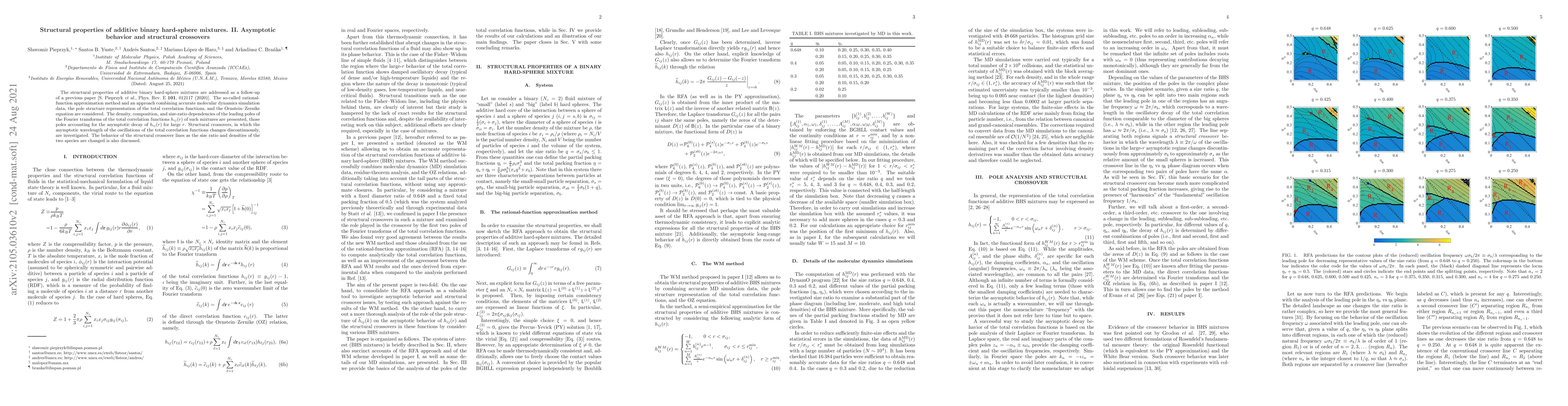 The structural properties of additive binary hard-sphere mixtures are addressed as a follow-up of a previous paper [S. Pieprzyk et al., Phys. Rev. E 101, 012117 (2020)]. The so-called rational-function approximation method and an approach combining accurate molecular dynamics simulation data, the pole structure representation of the total correlation functions, and the Ornstein-Zernike equation are considered. The density, composition, and size-ratio dependencies of the leading poles of the Fourier transforms of the total correlation functions $h_{ij} (r)$ of such mixtures are presented, those poles accounting for the asymptotic decay of $h_{ij} (r)$ for large $r$. Structural crossovers, in which the asymptotic wavelength of the oscillations of the total correlation functions changes discontinuously, are investigated. The behavior of the structural crossover lines as the size ratio and densities of the two species are changed is also discussed.