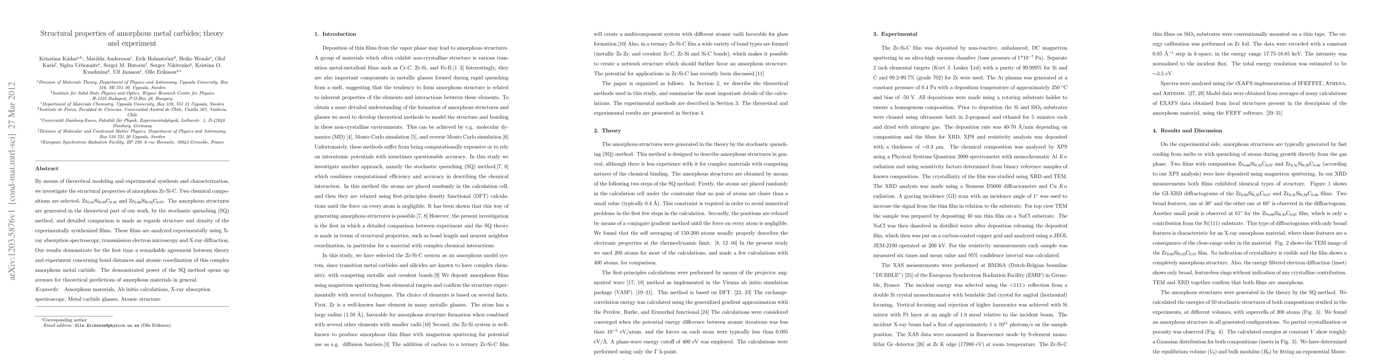 By means of theoretical modeling and experimental synthesis and characterization, we investigate the structural properties of amorphous Zr-Si-C. Two chemical compositions are selected, Zr0.31Si0.29C0.40 and Zr0.60Si0.33C0.07. The amorphous structures are generated in the theoretical part of our work, by the stochastic quenching (SQ) method, and detailed comparison is made as regards structure and density of the experimentally synthesized films. These films are analyzed experimentally using X-ray absorption spectroscopy, transmission electron microscopy and X-ray diffraction. Our results demonstrate for the first time a remarkable agreement between theory and experiment concerning bond distances and atomic coordination of this complex amorphous metal carbide. The demonstrated power of the SQ method opens up avenues for theoretical predictions of amorphous materials in general.