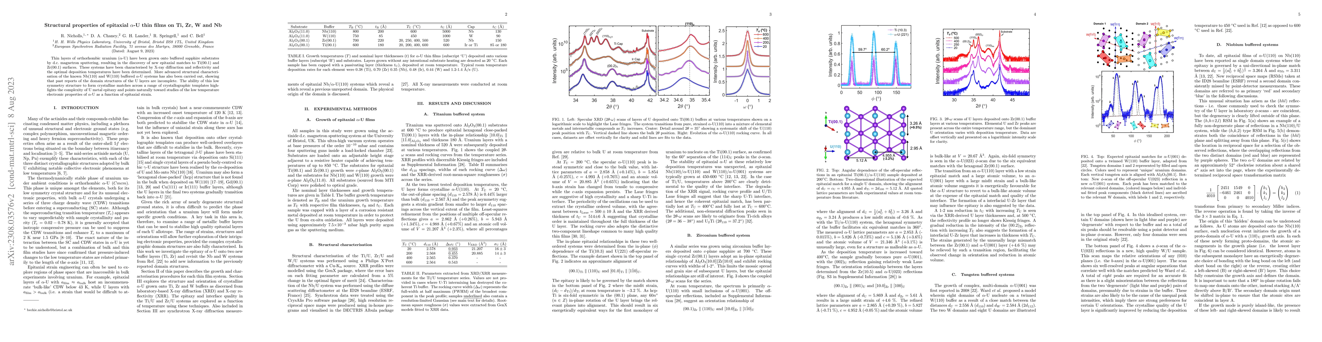 This study investigates the epitaxial growth of orthorhombic uranium ({\alpha}-U) on Ti, Zr, W, and Nb substrates using d.c. magnetron sputtering. New epitaxial matches to Ti(00.1) and Zr(00.1) surfaces were discovered, while advanced structural characterization revealed incomplete domain structures in previously reported Nb(110) and W(110) systems.