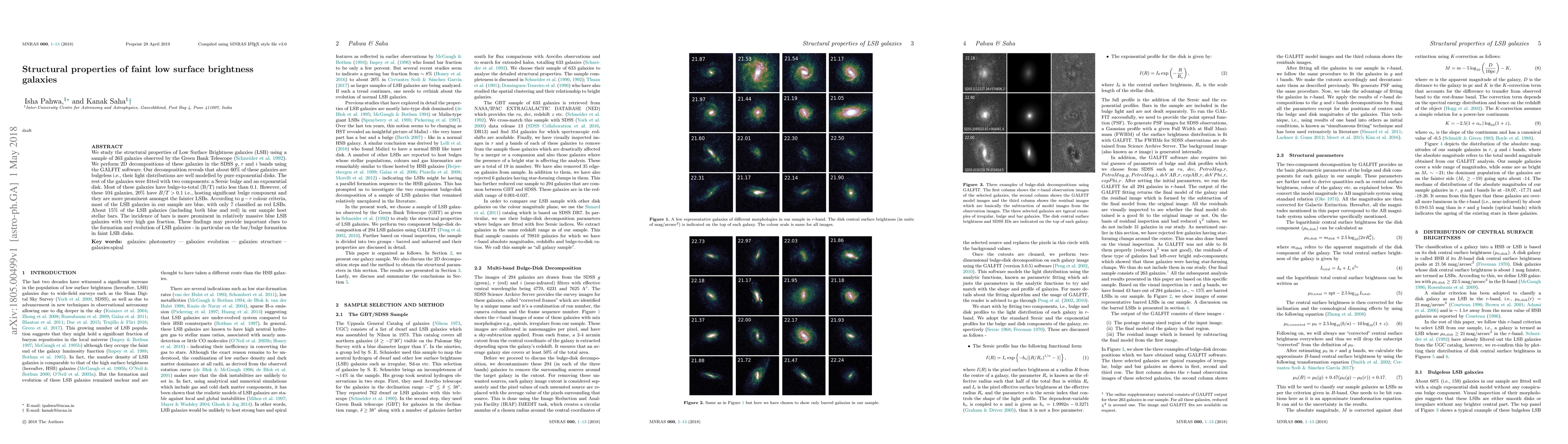 This study analyzes the structural properties of 263 Low Surface Brightness galaxies using GALFIT software, revealing that 60% lack bulges and are modeled by exponential disks. The remaining galaxies, mostly with small bulges, show a notable 20% with significant bulges, especially among fainter LSBs. Most galaxies are blue, with a small fraction hosting stellar bars, particularly in massive blue LSBs with high gas fractions.