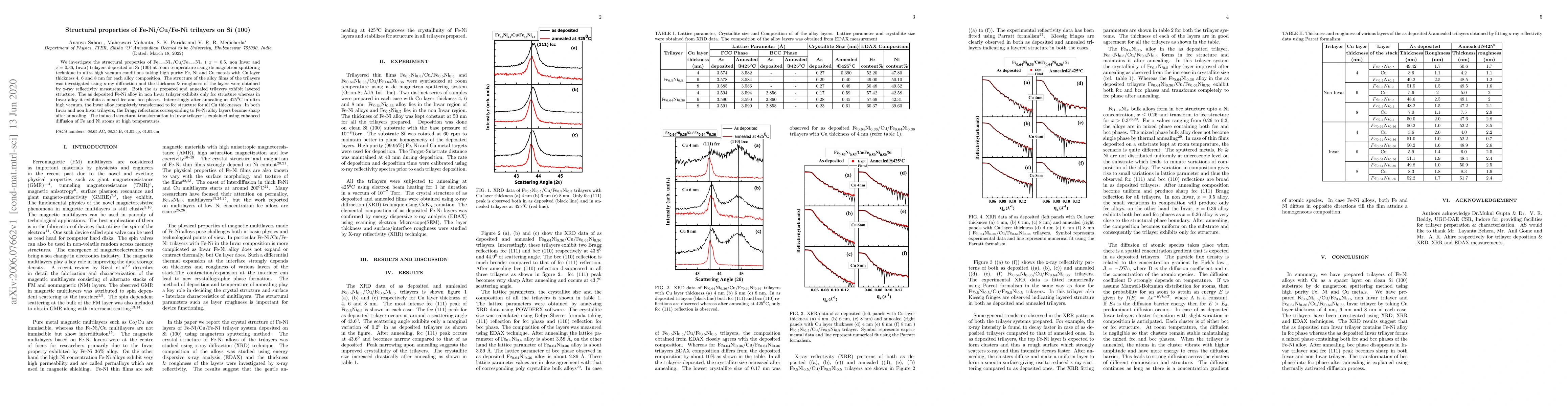 The study investigates Fe-Ni/Cu/Fe-Ni trilayers on Si (100) using dc magnetron sputtering in ultra-high vacuum conditions. X-ray diffraction and x-ray reflectivity measurements are employed to analyze the structure, thickness, and roughness of the layers.