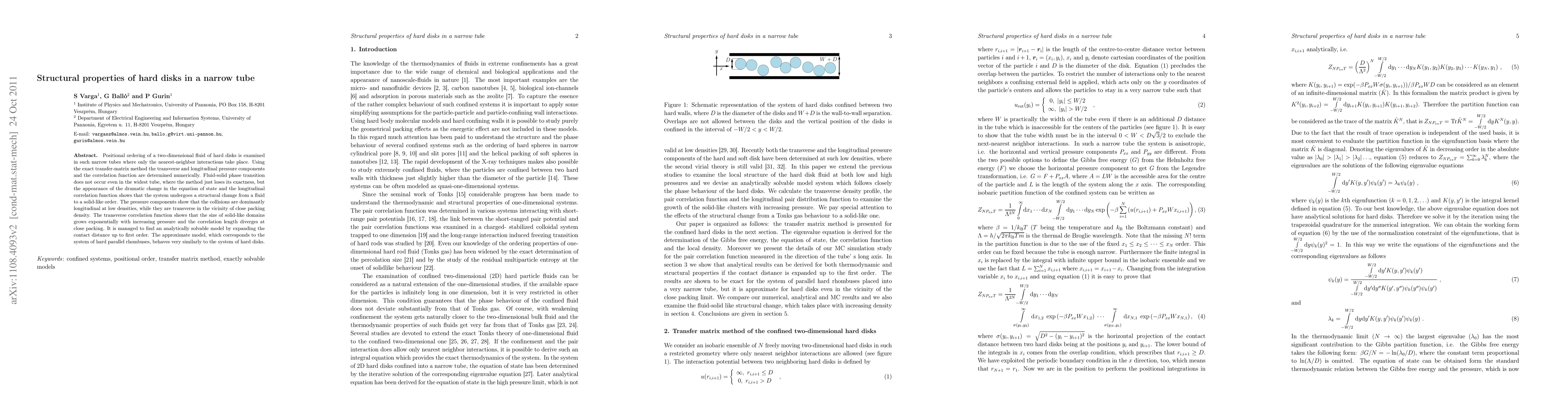 This paper investigates the positional ordering of hard disks in narrow tubes, revealing a structural change from fluid to solid-like order without a phase transition. The study uses the exact transfer-matrix method to determine pressure components and correlation functions, showing dominant longitudinal collisions at low densities and transverse collisions near close packing.