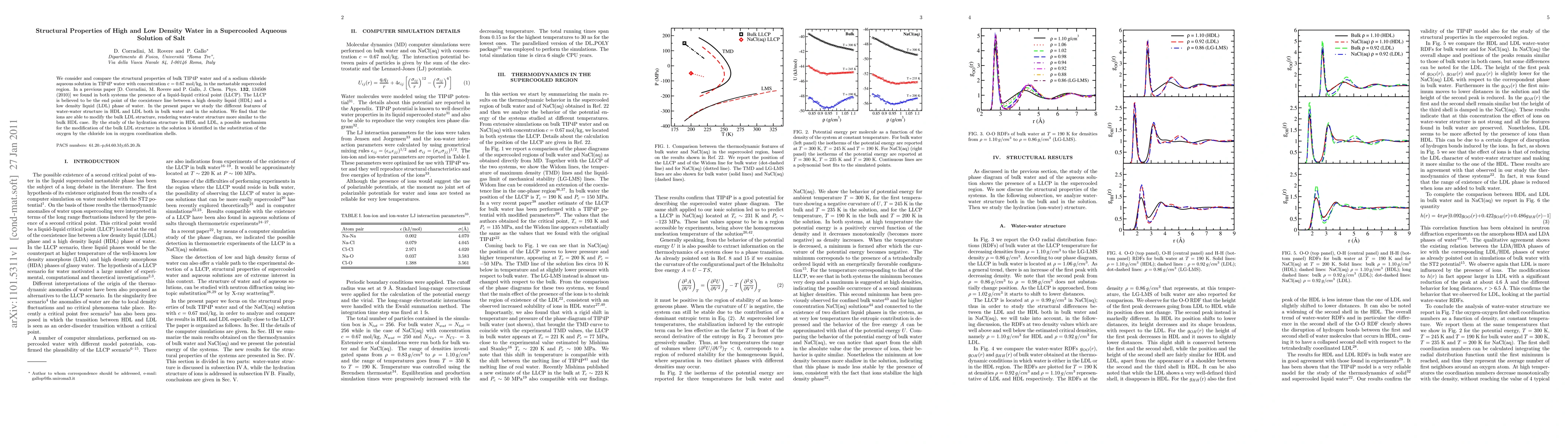 This paper compares the structural properties of high and low density water phases in both pure TIP4P water and a supercooled sodium chloride solution, identifying a liquid-liquid critical point. It finds that chloride ions modify the low density liquid structure, making it more similar to the high density liquid structure, likely through chloride substitution in oxygen coordination shells.