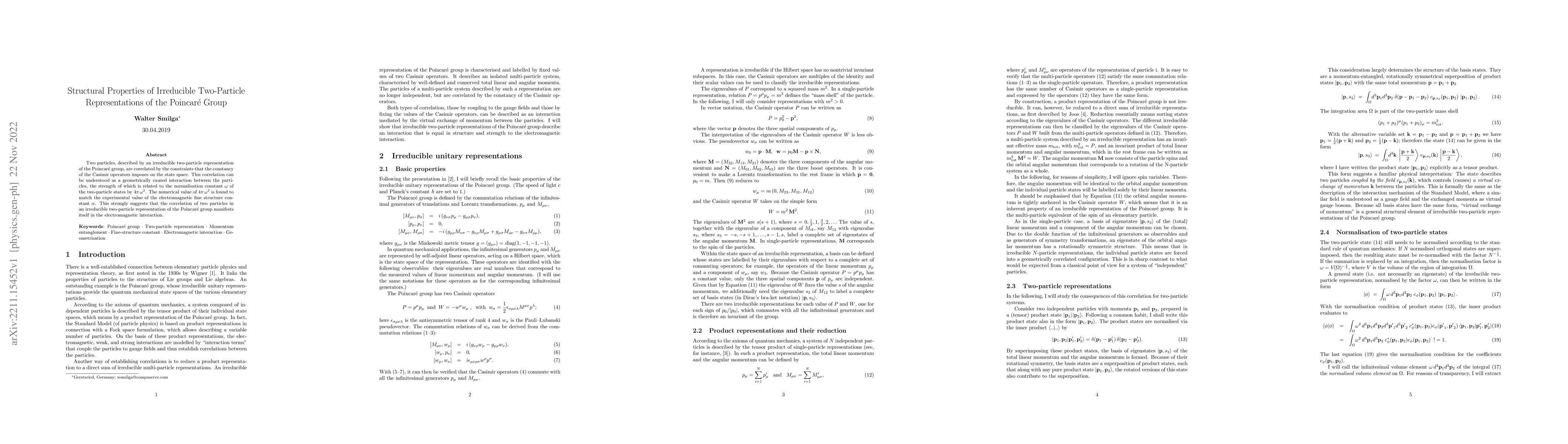 This paper investigates the structural properties of irreducible two-particle representations of the Poincaré group, revealing a geometric interaction between particles governed by the Casimir operators. The correlation strength, proportional to $4\pi\,\omega^2$, matches the electromagnetic fine structure constant $\alpha$, suggesting a connection between this correlation and electromagnetic interactions.