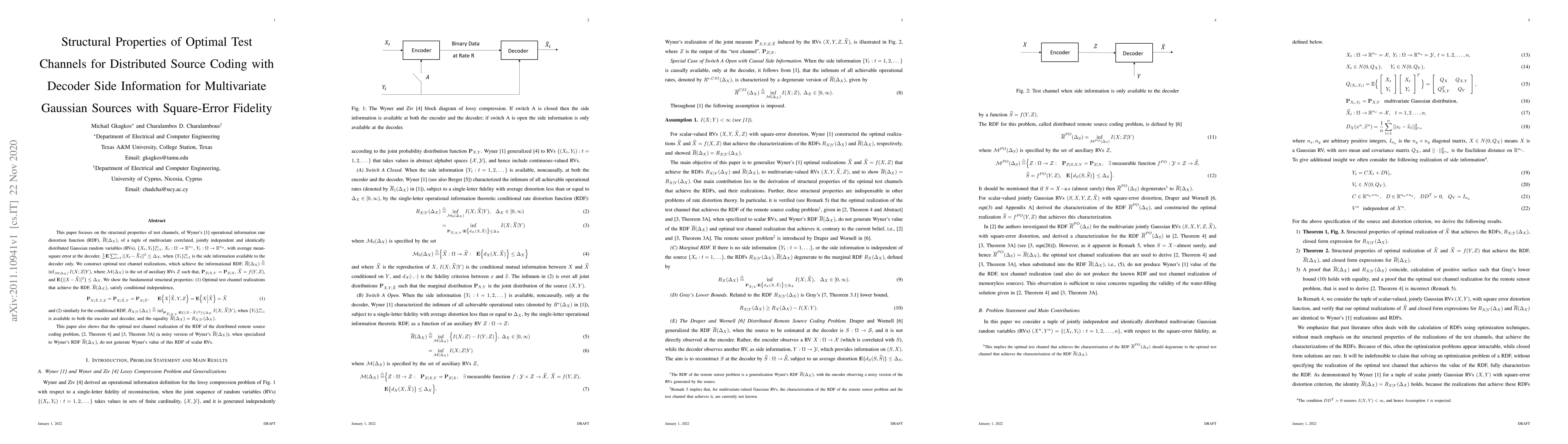 This paper focuses on the structural properties of test channels, of Wyner's operational information rate distortion function (RDF), $\overline{R}(\Delta_X)$, of a tuple of multivariate correlated, jointly independent and identically distributed Gaussian random variables (RVs), $\{X_t, Y_t\}_{t=1}^\infty$, $X_t: \Omega \rightarrow {\mathbb R}^{n_x}$, $Y_t: \Omega \rightarrow {\mathbb R}^{n_y}$, with average mean-square error at the decoder, $\frac{1}{n} {\bf E}\sum_{t=1}^n||X_t - \widehat{X}_t||^2\leq \Delta_X$, when $\{Y_t\}_{t=1}^\infty$ is the side information available to the decoder only. We construct optimal test channel realizations, which achieve the informational RDF, $\overline{R}(\Delta_X) \triangleq\inf_{{\cal M}(\Delta_X)} I(X;Z|Y)$, where ${\cal M}(\Delta_X)$ is the set of auxiliary RVs $Z$ such that, ${\bf P}_{Z|X,Y}={\bf P}_{Z|X}$, $\widehat{X}=f(Y,Z)$, and ${\bf E}\{||X-\widehat{X}||^2\}\leq \Delta_X$. We show the fundamental structural properties: (1) Optimal test channel realizations that achieve the RDF, $\overline{R}(\Delta_X)$, satisfy conditional independence, $ {\bf P}_{X|\widehat{X}, Y, Z}={\bf P}_{X|\widehat{X},Y}={\bf P}_{X|\widehat{X}}, \hspace{.2in} {\bf E}\Big\{X\Big|\widehat{X}, Y, Z\Big\}={\bf E}\Big\{X\Big|\widehat{X}\Big\}=\widehat{X} $ and (2) similarly for the conditional RDF, ${R}_{X|Y}(\Delta_X) \triangleq \inf_{{\bf P}_{\widehat{X}|X,Y}:{\bf E}\{||X-\widehat{X}||^2\} \leq \Delta_X} I(X; \widehat{X}|Y)$, when $\{Y_t\}_{t=1}^\infty$ is available to both the encoder and decoder, and the equality $\overline{R}(\Delta_X)={R}_{X|Y}(\Delta_X)$.