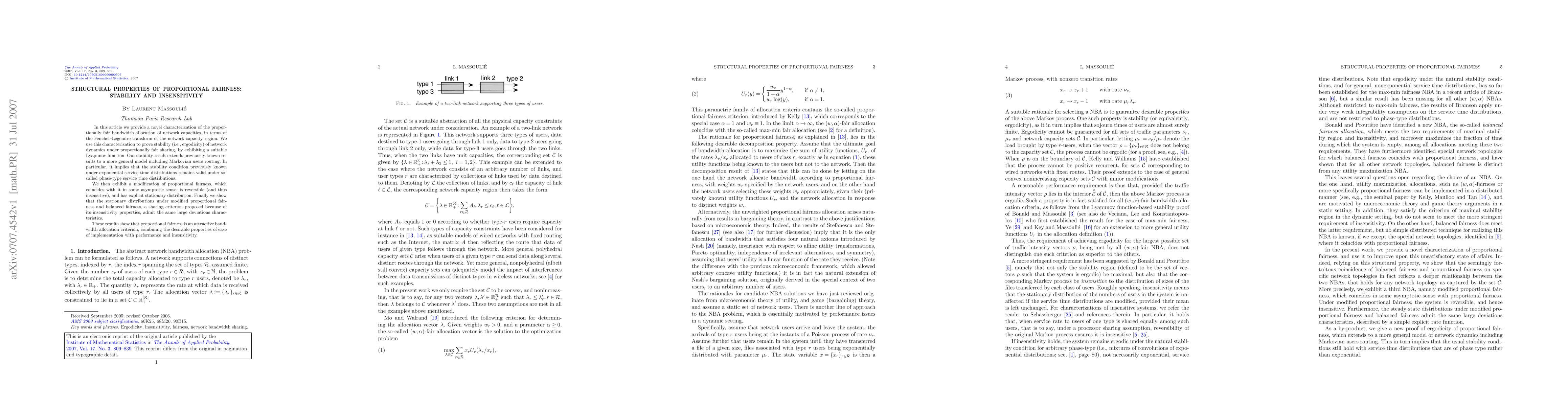 In this article we provide a novel characterization of the proportionally fair bandwidth allocation of network capacities, in terms of the Fenchel--Legendre transform of the network capacity region. We use this characterization to prove stability (i.e., ergodicity) of network dynamics under proportionally fair sharing, by exhibiting a suitable Lyapunov function. Our stability result extends previously known results to a more general model including Markovian users routing. In particular, it implies that the stability condition previously known under exponential service time distributions remains valid under so-called phase-type service time distributions. We then exhibit a modification of proportional fairness, which coincides with it in some asymptotic sense, is reversible (and thus insensitive), and has explicit stationary distribution. Finally we show that the stationary distributions under modified proportional fairness and balanced fairness, a sharing criterion proposed because of its insensitivity properties, admit the same large deviations characteristics. These results show that proportional fairness is an attractive bandwidth allocation criterion, combining the desirable properties of ease of implementation with performance and insensitivity.