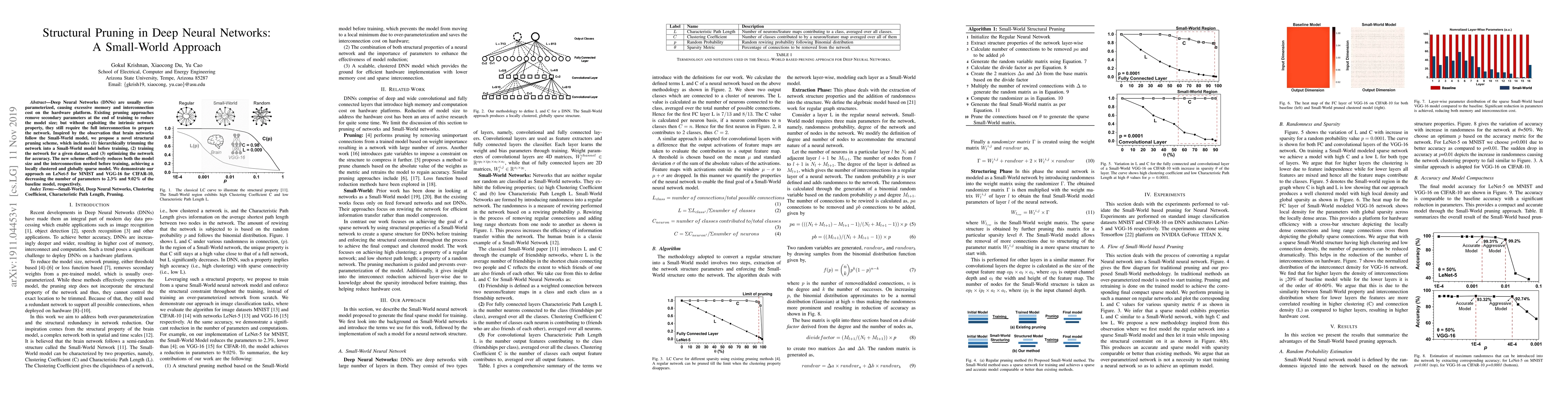 Deep Neural Networks (DNNs) are usually over-parameterized, causing excessive memory and interconnection cost on the hardware platform. Existing pruning approaches remove secondary parameters at the end of training to reduce the model size; but without exploiting the intrinsic network property, they still require the full interconnection to prepare the network. Inspired by the observation that brain networks follow the Small-World model, we propose a novel structural pruning scheme, which includes (1) hierarchically trimming the network into a Small-World model before training, (2) training the network for a given dataset, and (3) optimizing the network for accuracy. The new scheme effectively reduces both the model size and the interconnection needed before training, achieving a locally clustered and globally sparse model. We demonstrate our approach on LeNet-5 for MNIST and VGG-16 for CIFAR-10, decreasing the number of parameters to 2.3% and 9.02% of the baseline model, respectively.