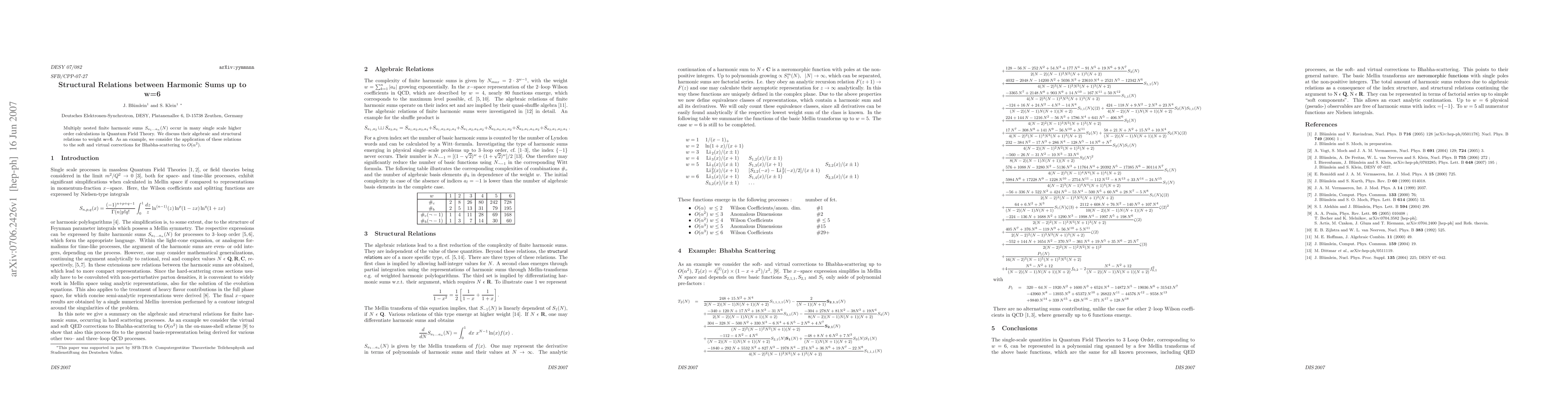 Multiply nested finite harmonic sums $S_{a_1 ... a_n}(N)$ occur in many single scale higher order calculations in Quantum Field Theory. We discuss their algebraic and structural relations to weight {\sf w=6}. As an example, we consider the application of these relations to the soft and virtual corrections for Bhabha-scattering to $O(\alpha^2)$.