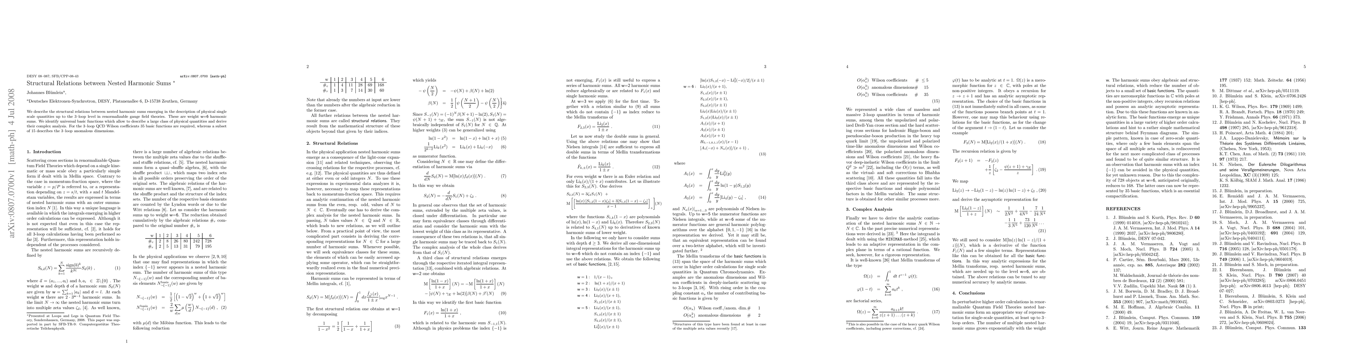 We describe the structural relations between nested harmonic sums emerging in the description of physical single scale quantities up to the 3--loop level in renormalizable gauge field theories. These are weight {\sf w=6} harmonic sums. We identify universal basic functions which allow to describe a large class of physical quantities and derive their complex analysis. For the 3--loop QCD Wilson coefficients 35 basic functions are required, whereas a subset of 15 describes the 3--loop anomalous dimensions.
