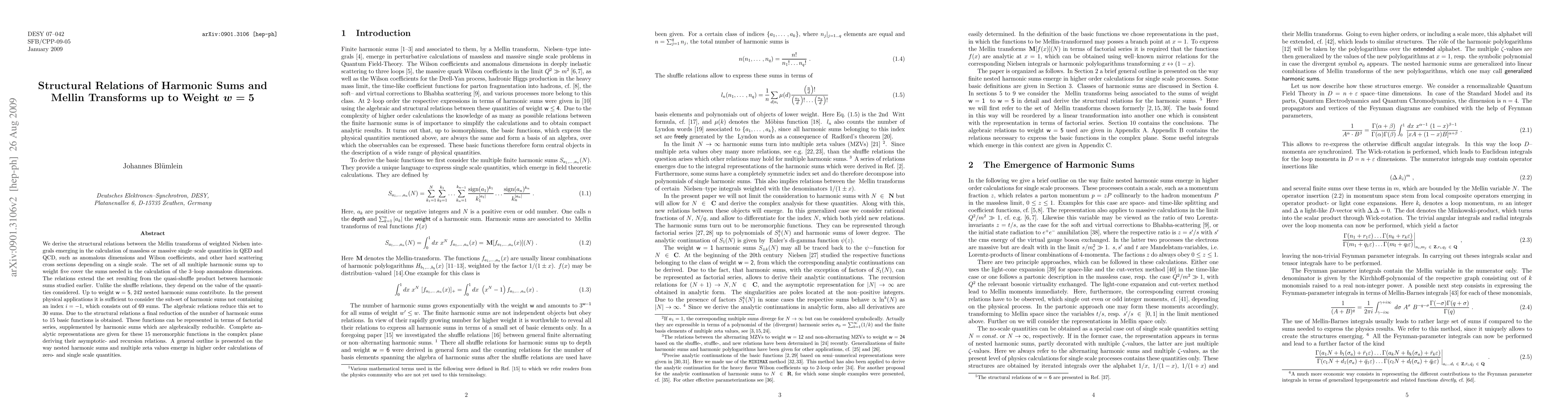 We derive the structural relations between the Mellin transforms of weighted Nielsen integrals emerging in the calculation of massless or massive single--scale quantities in QED and QCD, such as anomalous dimensions and Wilson coefficients, and other hard scattering cross sections depending on a single scale. The set of all multiple harmonic sums up to weight five cover the sums needed in the calculation of the 3--loop anomalous dimensions. The relations extend the set resulting from the quasi-shuffle product between harmonic sums studied earlier. Unlike the shuffle relations, they depend on the value of the quantities considered. Up to weight {\sf w = 5}, 242 nested harmonic sums contribute. In the present physical applications it is sufficient to consider the sub-set of harmonic sums not containing an index $i = -1$, which consists out of 69 sums. The algebraic relations reduce this set to 30 sums. Due to the structural relations a final reduction of the number of harmonic sums to {15} basic functions is obtained. These functions can be represented in terms of factorial series, supplemented by harmonic sums which are algebraically reducible. Complete analytic representations are given for these {15} meromorphic functions in the complex plane deriving their asymptotic- and recursion relations. A general outline is presented on the way nested harmonic sums and multiple zeta values emerge in higher order calculations of zero- and single scale quantities.