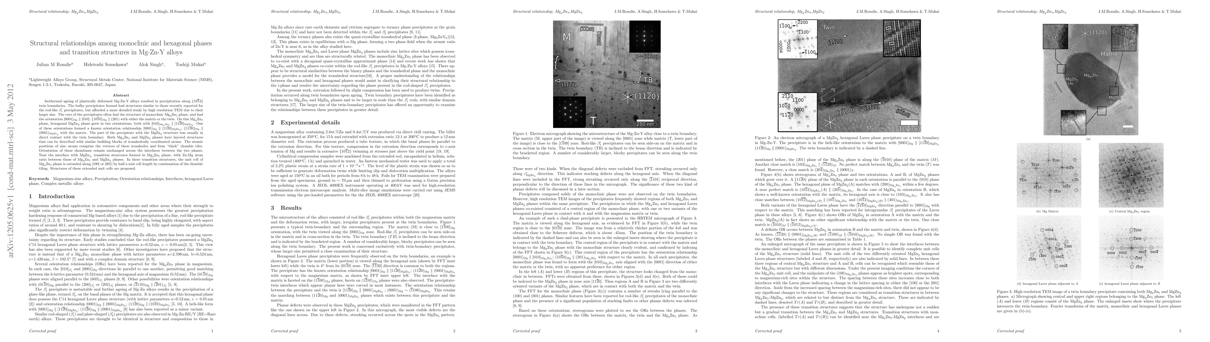 This paper investigates the structural relationships between monoclinic Mg4Zn7 and hexagonal MgZn2 phases in Mg-Zn-Y alloys, revealing detailed precipitate formation via high-resolution TEM. Transition structures with intermediate Zn:Mg ratios form at the Mg4Zn7/MgZn2 interface, maintaining rhombic tiling orientation.