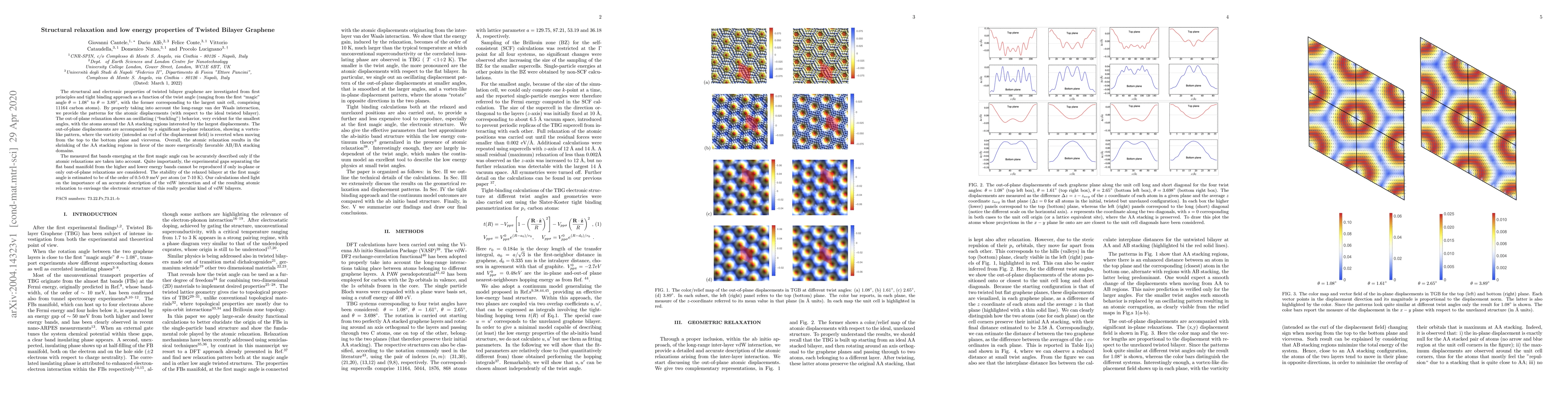 The structural and electronic properties of twisted bilayer graphene are investigated from first principles and tight binding approach as a function of the twist angle (ranging from the first "magic" angle $\theta=1.08^\circ$ to $\theta=3.89^\circ$, with the former corresponding to the largest unit cell, comprising 11164 carbon atoms). By properly taking into account the long-range van der Waals interaction, we provide the patterns for the atomic displacements (with respect to the ideal twisted bilayer). The out-of-plane relaxation shows an oscillating ("buckling") behavior, very evident for the smallest angles, with the atoms around the AA stacking regions interested by the largest displacements. The out-of-plane displacements are accompanied by a significant in-plane relaxation, showing a vortex-like pattern, where the vorticity (intended as curl of the displacement field) is reverted when moving from the top to the bottom plane and viceversa. Overall, the atomic relaxation results in the shrinking of the AA stacking regions in favor of the more energetically favorable AB/BA stacking domains. The measured flat bands emerging at the first magic angle can be accurately described only if the atomic relaxations are taken into account. Quite importantly, the experimental gaps separating the flat band manifold from the higher and lower energy bands cannot be reproduced if only in-plane or only out-of-plane relaxations are considered. The stability of the relaxed bilayer at the first magic angle is estimated to be of the order of 0.5-0.9 meV per atom (or 7-10 K). Our calculations shed light on the importance of an accurate description of the vdW interaction and of the resulting atomic relaxation to envisage the electronic structure of this really peculiar kind of vdW bilayers.