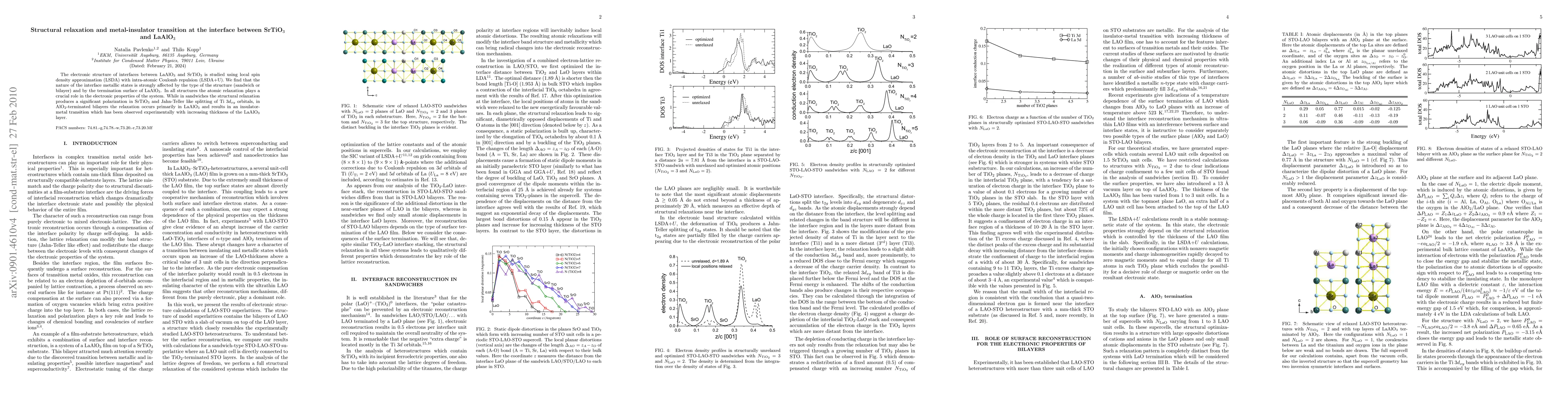 The electronic structure of interfaces between LaAlO$_3$ and SrTiO$_3$ is studied using local spin density approximation (LSDA) with intra-atomic Coulomb repulsion (LSDA+U). We find that the nature of the interface metallic states is strongly affected by the type of the structure (sandwich or bilayer) and by the termination surface of LaAlO$_3$. In all structures the atomic relaxation plays a crucial role in the electronic properties of the system. While in sandwiches the structural relaxation produces a significant polarization in SrTiO$_3$ and Jahn-Teller like splitting of Ti $3d_{xy}$ orbitals, in AlO$_2$-terminated bilayers the relaxation occurs primarily in LaAlO$_3$ and results in an insulator-metal transition which has been observed experimentally with increasing thickness of the LaAlO$_3$ layer.
