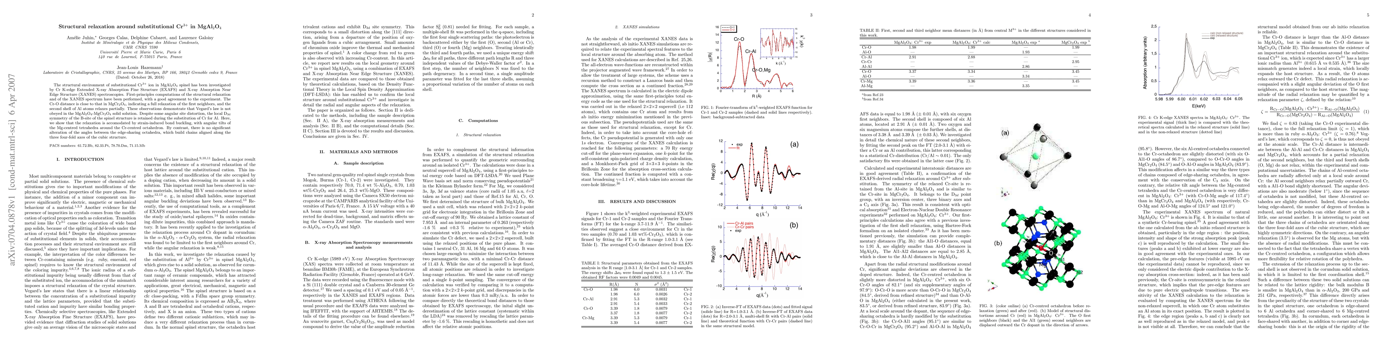 The structural environment of substitutional Cr3+ ion in MgAl2O4 spinel has been investigated by Cr K-edge Extended X-ray Absorption Fine Structure (EXAFS) and X-ray Absorption Near Edge Structure (XANES) spectroscopies. First-principles computations of the structural relaxation and of the XANES spectrum have been performed, with a good agreement to the experiment. The Cr-O distance is close to that in MgCr2O4, indicating a full relaxation of the first neighbors, and the second shell of Al atoms relaxes partially. These observations demonstrate that Vegard's law is not obeyed in the MgAl2O4-MgCr2O4 solid solution. Despite some angular site distortion, the local D3d symmetry of the B-site of the spinel structure is retained during the substitution of Cr for Al. Here, we show that the relaxation is accomodated by strain-induced bond buckling, with angular tilts of the Mg-centred tetrahedra around the Cr-centred octahedron. By contrast, there is no significant alteration of the angles between the edge-sharing octahedra, which build chains aligned along the three four-fold axes of the cubic structure.