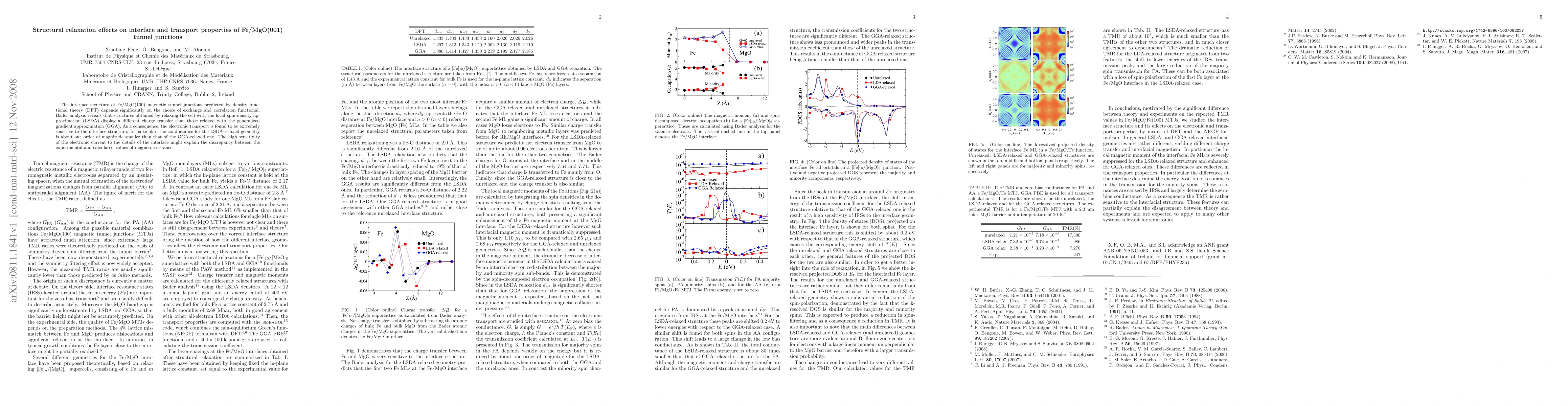 The interface structure of Fe/MgO(100) magnetic tunnel junctions predicted by density functional theory (DFT) depends significantly on the choice of exchange and correlation functional. Bader analysis reveals that structures obtained by relaxing the cell with the local spin-density approximation (LSDA) display a different charge transfer than those relaxed with the generalized gradient approximation (GGA). As a consequence, the electronic transport is found to be extremely sensitive to the interface structure. In particular, the conductance for the LSDA-relaxed geometry is about one order of magnitude smaller than that of the GGA-relaxed one. The high sensitivity of the electronic current to the details of the interface might explain the discrepancy between the experimental and calculated values of magnetoresistance.
