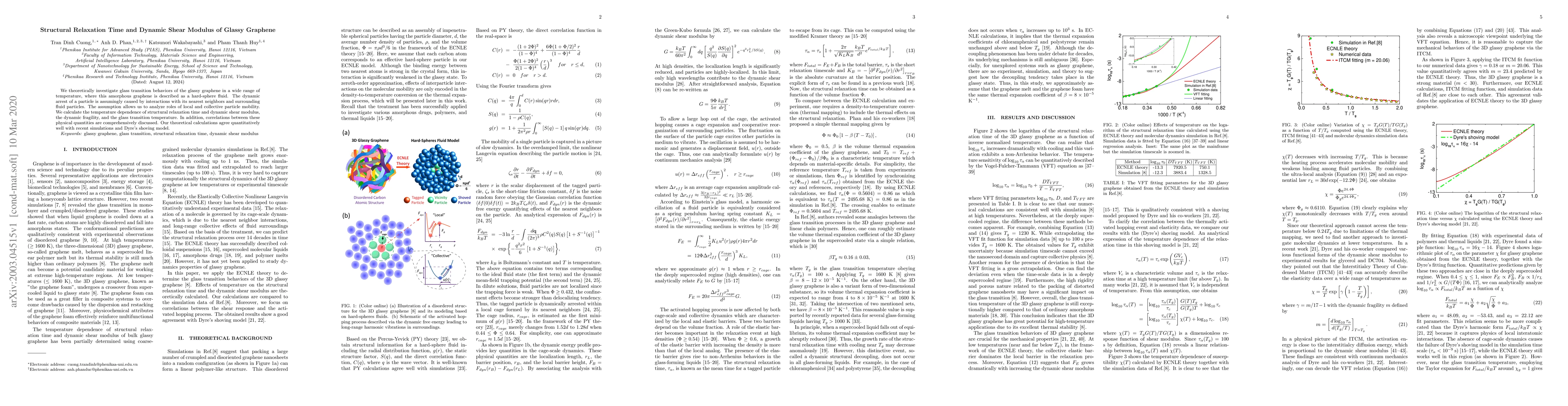 We theoretically investigate glass transition behaviors of the glassy graphene in a wide range of temperature, where this amorphous graphene is described as a hard-sphere fluid. The dynamic arrest of a particle is assumingly caused by interactions with its nearest neighbors and surrounding fluid particles. The assumption allows us to analyze roles of local and collective particle mobility. We calculate the temperature dependence of structural relaxation time and dynamic shear modulus, the dynamic fragility, and the glass transition temperature. In addition, correlations between these physical quantities are comprehensively discussed. Our theoretical calculations agree quantitatively well with recent simulations and Dyre's shoving model.