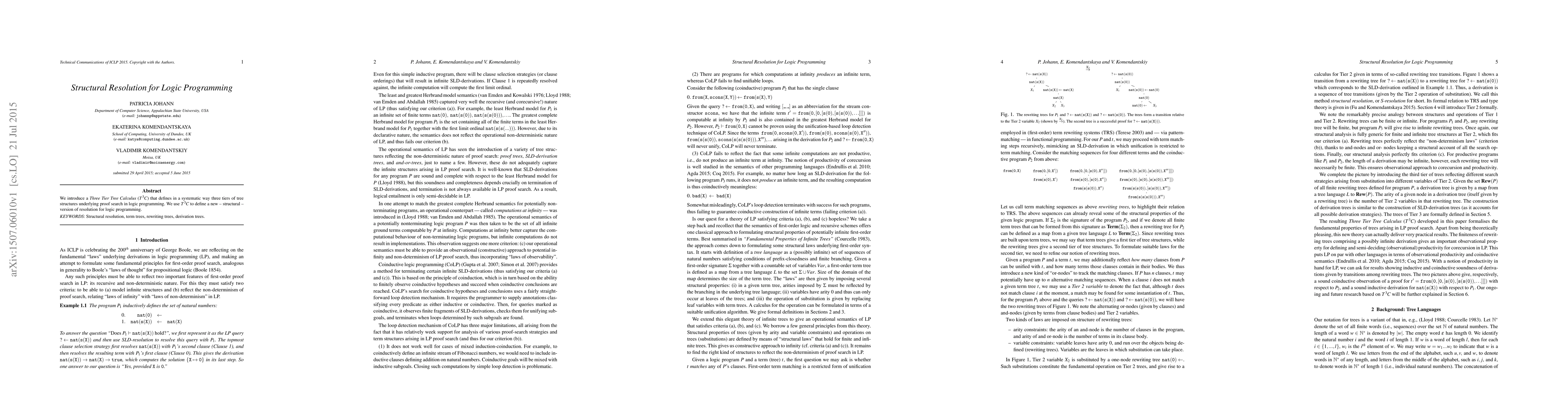 This paper presents a Three Tier Tree Calculus (3TC) that systematically defines tree structures in logic programming proof search. It introduces a new structural resolution method for logic programming using 3TC.