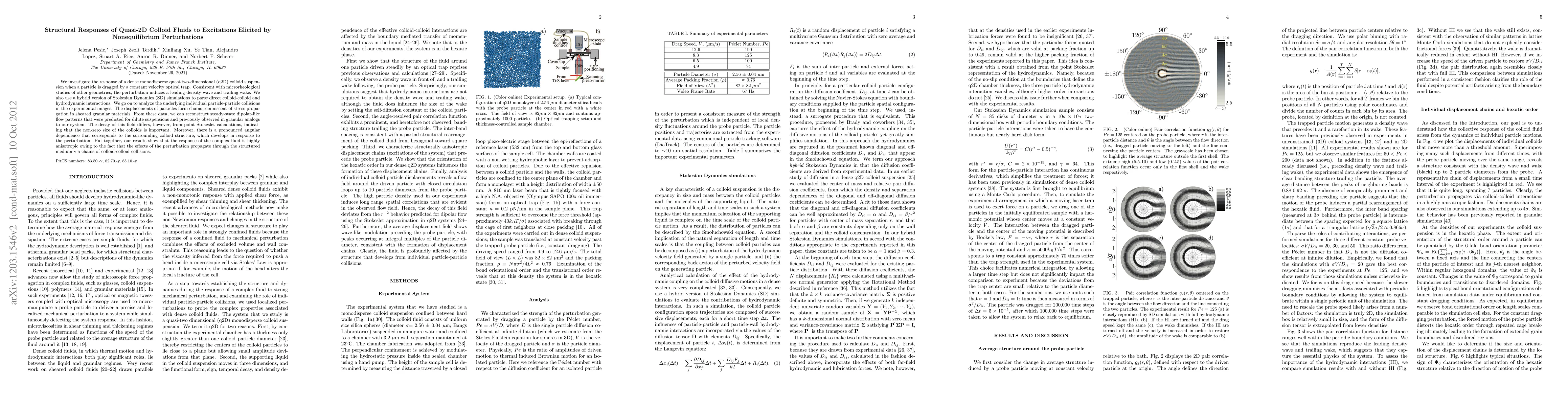 We investigate the response of a dense monodisperse quasi-two-dimensional (q2D) colloid suspension when a particle is dragged by a constant velocity optical trap. Consistent with microrheological studies of other geometries, the perturbation induces a leading density wave and trailing wake, and we use Stokesian Dynamics (SD) simulations to parse direct colloid-colloid and hydrodynamic interactions. We go on to analyze the underlying individual particle-particle collisions in the experimental images. The displacements of particles form chains reminiscent of stress propagation in sheared granular materials. From these data, we can reconstruct steady-state dipolar flow patterns that were predicted for dilute suspensions and previously observed in granular analogs to our system. The decay of this field differs, however, from point Stokeslet calculations, indicating that the finite size of the colloids is important. Moreover, there is a pronounced angular dependence that corresponds to the surrounding colloid structure, which evolves in response to the perturbation. Put together, our results show that the response of the complex fluid is highly anisotropic owing to the fact that the effects of the perturbation propagate through the structured medium via chains of colloid-colloid collisions.