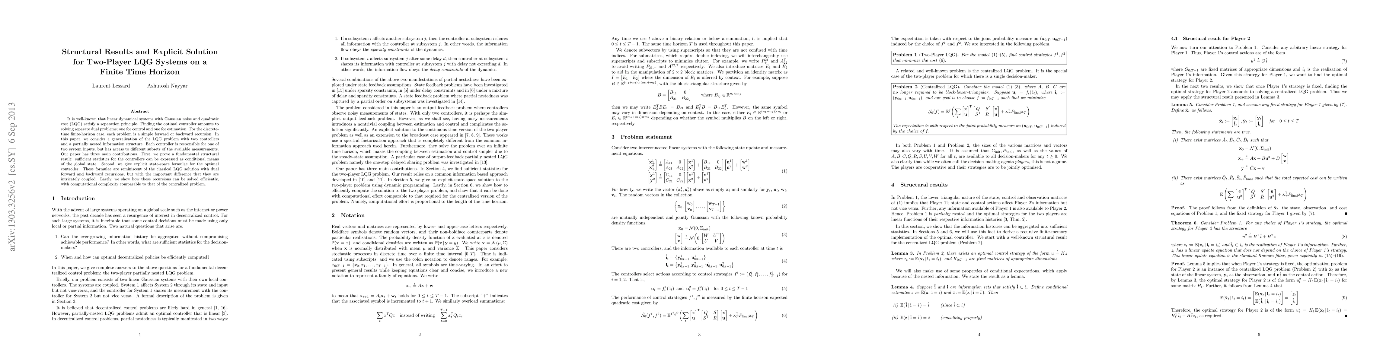 This paper presents structural results and explicit solutions for two-player LQG systems over a finite time horizon. It proves that sufficient statistics for the controllers are conditional means of the global state, provides coupled state-space formulae for optimal controllers, and demonstrates efficient solution methods with computational complexity similar to centralized problems.