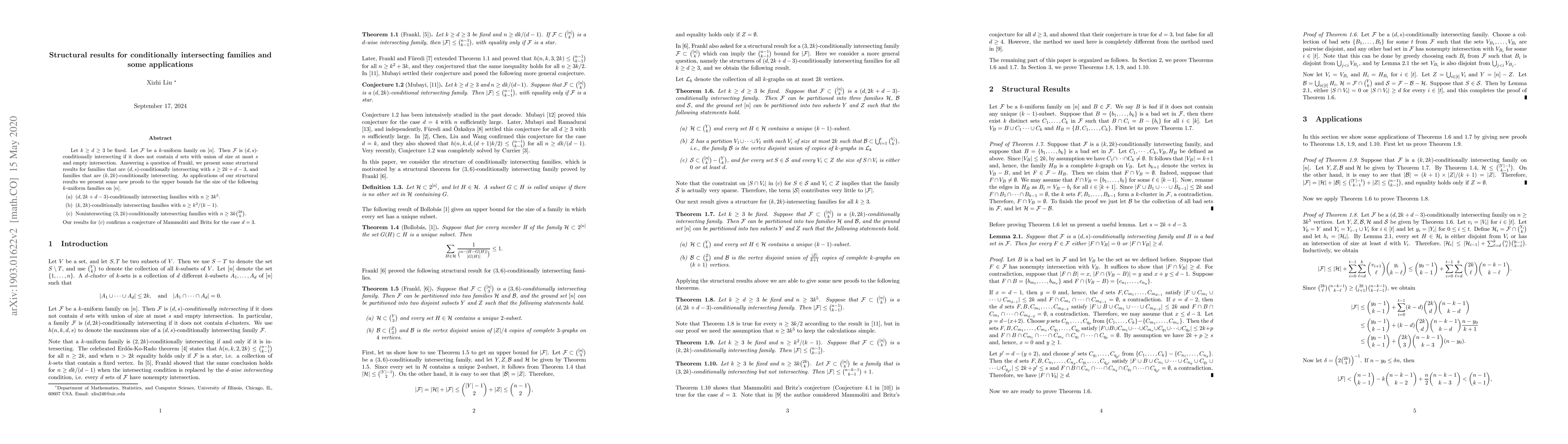 This paper presents structural results for $(d,s)$-conditionally intersecting $k$-uniform families, specifically for $s\ge 2k+d-3$ and $(k,2k)$ cases. It provides new proofs for upper bounds on the sizes of these families under various conditions, confirming a conjecture for $d=3$.