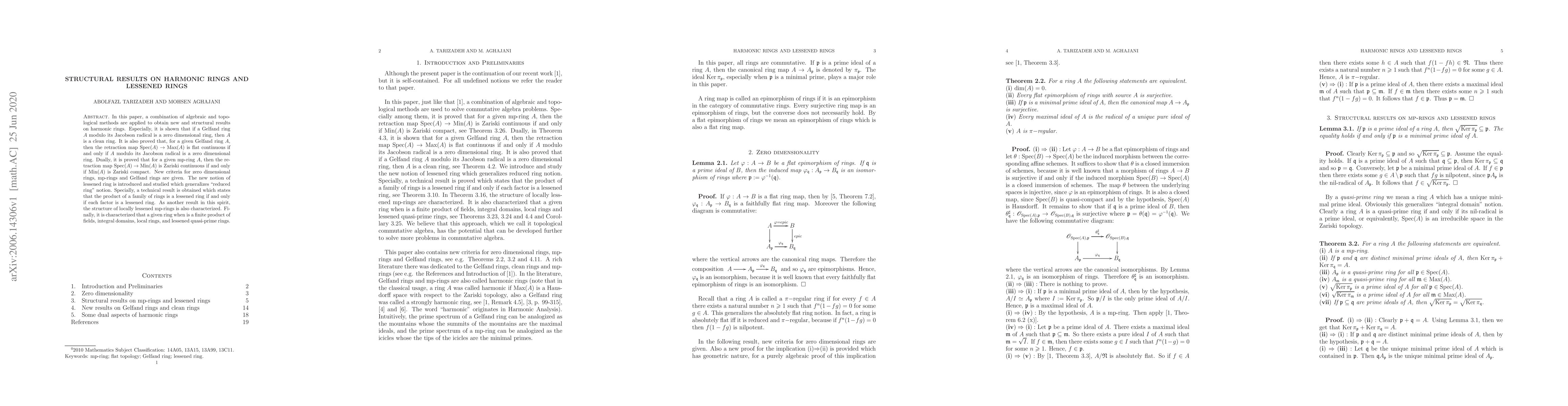 In this paper, a combination of algebraic and topological methods are applied to obtain new and structural results on harmonic rings. Especially, it is shown that if a Gelfand ring $A$ modulo its Jacobson radical is a zero dimensional ring, then $A$ is a clean ring. It is also proved that, for a given Gelfand ring $A$, then the retraction map Spec$(A)\rightarrow{\rm Max}(A)$ is flat continuous if and only if $A$ modulo its Jacobson radical is a zero dimensional ring. Dually, it is proved that for a given mp-ring $A$, then the retraction map Spec$(A)\rightarrow{\rm Min}(A)$ is Zariski continuous if and only if ${\rm Min}(A)$ is Zariski compact. New criteria for zero dimensional rings, mp-rings and Gelfand rings are given. The new notion of lessened ring is introduced and studied which generalizes "reduced ring" notion. Specially, a technical result is obtained which states that the product of a family of rings is a lessened ring if and only if each factor is a lessened ring. As another result in this spirit, the structure of locally lessened mp-rings is also characterized. Finally, it is characterized that a given ring when is a finite product of fields, integral domains, local rings, and lessened quasi-prime rings.