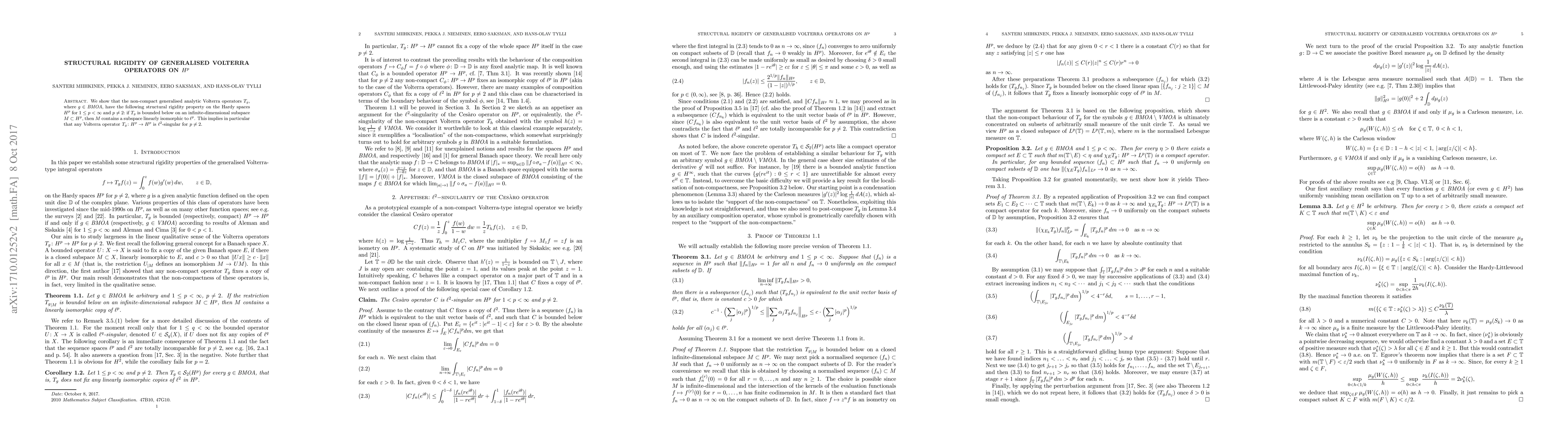 We show that the non-compact generalised analytic Volterra operators $T_g$, where $g \in \mathit{BMOA}$, have the following structural rigidity property on the Hardy spaces $H^p$ for $1 \le p < \infty$ and $p \neq 2$: if $T_g$ is bounded below on an infinite-dimensional subspace $M \subset H^p$, then $M$ contains a subspace linearly isomorphic to $\ell^p$. This implies in particular that any Volterra operator $T_g\colon H^p \to H^p$ is $\ell^2$-singular for $p \neq 2$.