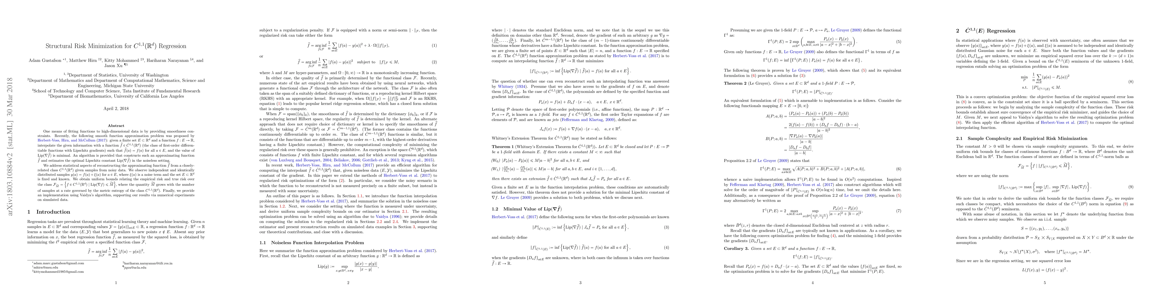 One means of fitting functions to high-dimensional data is by providing smoothness constraints. Recently, the following smooth function approximation problem was proposed: given a finite set $E \subset \mathbb{R}^d$ and a function $f: E \rightarrow \mathbb{R}$, interpolate the given information with a function $\widehat{f} \in \dot{C}^{1, 1}(\mathbb{R}^d)$ (the class of first-order differentiable functions with Lipschitz gradients) such that $\widehat{f}(a) = f(a)$ for all $a \in E$, and the value of $\mathrm{Lip}(\nabla \widehat{f})$ is minimal. An algorithm is provided that constructs such an approximating function $\widehat{f}$ and estimates the optimal Lipschitz constant $\mathrm{Lip}(\nabla \widehat{f})$ in the noiseless setting. We address statistical aspects of reconstructing the approximating function $\widehat{f}$ from a closely-related class $C^{1, 1}(\mathbb{R}^d)$ given samples from noisy data. We observe independent and identically distributed samples $y(a) = f(a) + \xi(a)$ for $a \in E$, where $\xi(a)$ is a noise term and the set $E \subset \mathbb{R}^d$ is fixed and known. We obtain uniform bounds relating the empirical risk and true risk over the class $\mathcal{F}_{\widetilde{M}} = \{f \in C^{1, 1}(\mathbb{R}^d) \mid \mathrm{Lip}(\nabla f) \leq \widetilde{M}\}$, where the quantity $\widetilde{M}$ grows with the number of samples at a rate governed by the metric entropy of the class $C^{1, 1}(\mathbb{R}^d)$. Finally, we provide an implementation using Vaidya's algorithm, supporting our results via numerical experiments on simulated data.