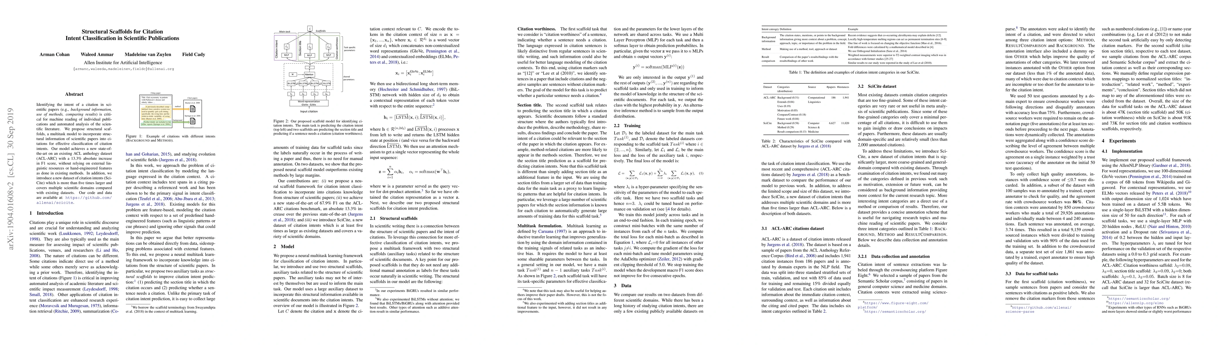 This paper proposes a multitask model called structural scaffolds to classify citation intents in scientific papers, achieving a 13.3% improvement in F1 score on the ACL-ARC dataset. The model leverages structural paper information without external linguistic resources, and introduces a new larger dataset, SciCite, for broader domain coverage.