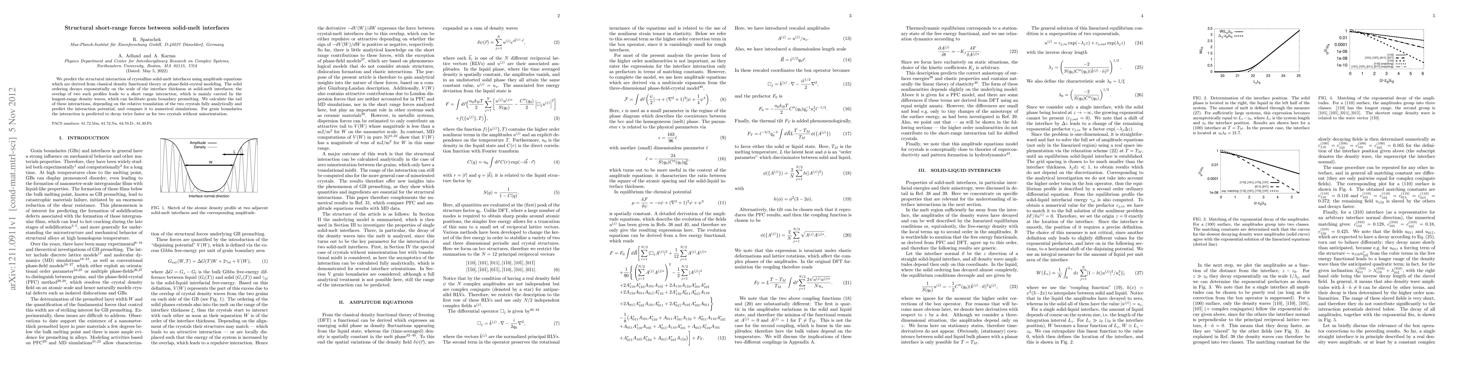 This paper predicts the structural short-range forces at crystalline solid-melt interfaces using density functional theory and phase-field-crystal modeling, revealing an exponential decay of solid ordering and a short-range interaction facilitated by density waves, which can lead to grain boundary premelting. The interaction potential is calculated analytically and compared to numerical simulations.