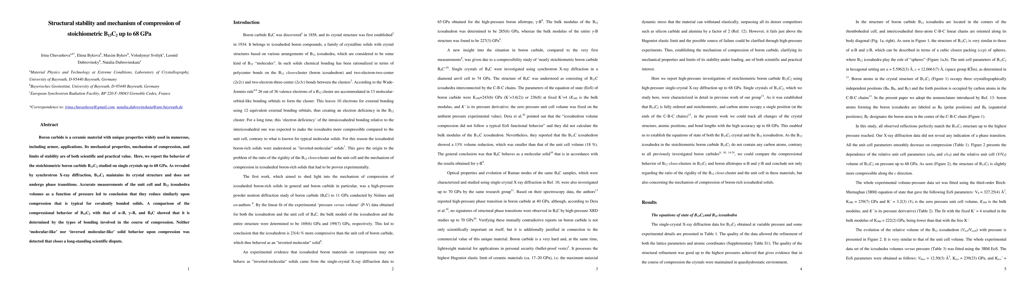Boron carbide is a ceramic material with unique properties widely used in numerous, including armor, applications. Its mechanical properties, mechanism of compression, and limits of stability are of both scientific and practical value. Here, we report the behavior of the stoichiometric boron carbide B13C2 studied on single crystals up to 68 GPa. As revealed by synchrotron X-ray diffraction, B13C2 maintains its crystal structure and does not undergo phase transitions. Accurate measurements of the unit cell and B12 icosahedra volumes as a function of pressure led to conclusion that they reduce similarly upon compression that is typical for covalently bonded solids. A comparison of the compressional behavior of B13C2 with that of alpha-B, gamma-B, and B4C showed that it is determined by the types of bonding involved in the course of compression. Neither molecular-like nor inversed-molecular-like solid behavior upon compression was detected that closes a long-standing scientific dispute.