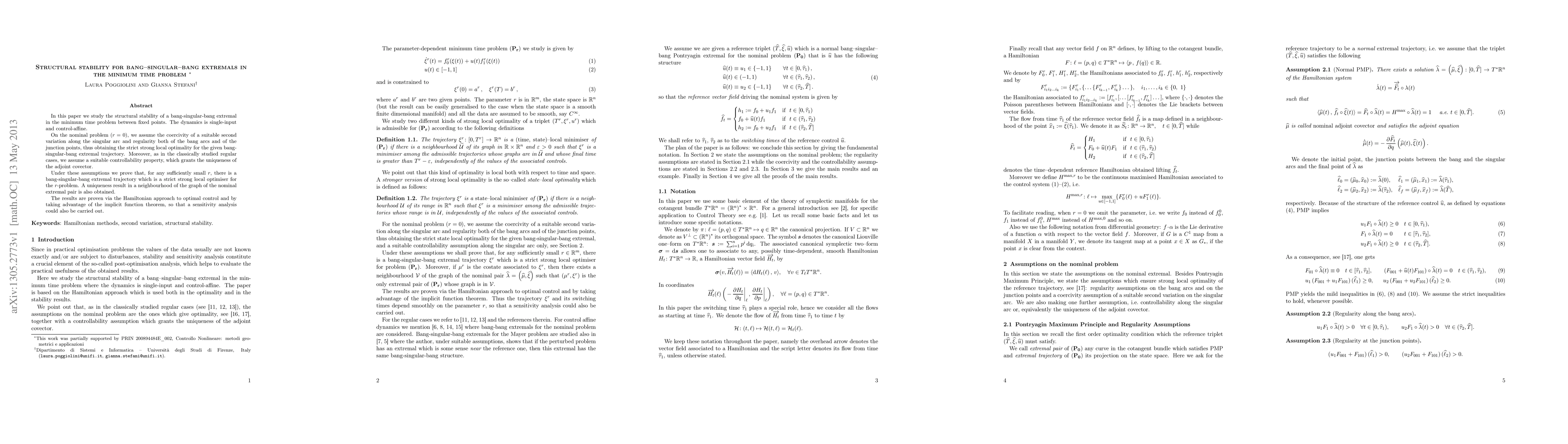 This paper explores the structural stability of bang-singular-bang extremals in the minimum time problem, proving strict strong local optimality under small perturbations. It uses the Hamiltonian approach and implicit function theorem to demonstrate the uniqueness and stability of these extremal trajectories.