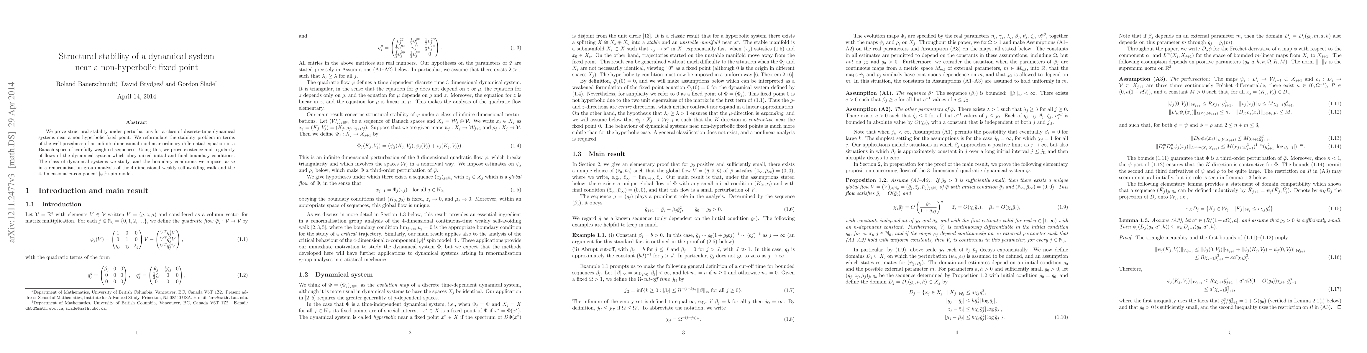 We prove structural stability under perturbations for a class of discrete-time dynamical systems near a non-hyperbolic fixed point. We reformulate the stability problem in terms of the well-posedness of an infinite-dimensional nonlinear ordinary differential equation in a Banach space of carefully weighted sequences. Using this, we prove existence and regularity of flows of the dynamical system which obey mixed initial and final boundary conditions. The class of dynamical systems we study, and the boundary conditions we impose, arise in a renormalisation group analysis of the 4-dimensional weakly self-avoiding walk and the 4-dimensional n-component $|\varphi|^4$ spin model.