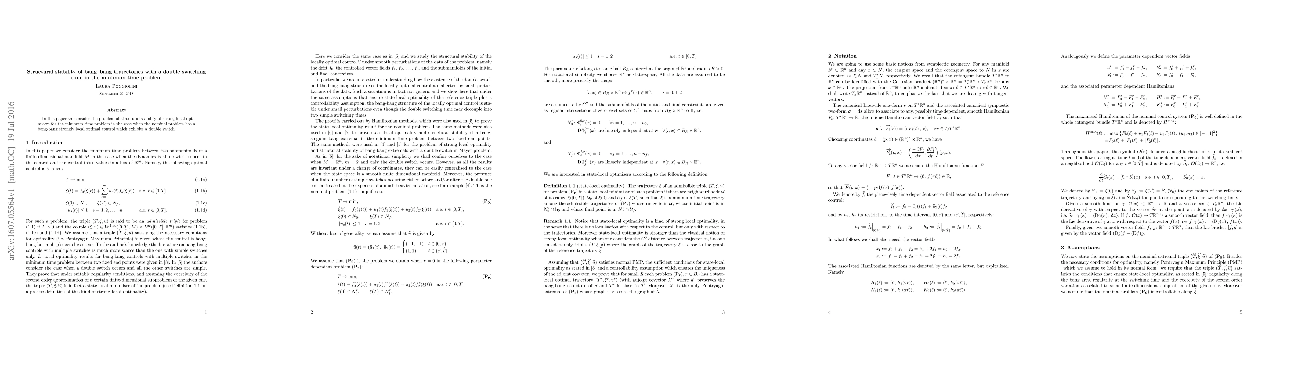 This paper investigates the structural stability of strong local optimisers for the minimum time problem, focusing on bang-bang controls with a double switching time. It examines how such controls maintain optimality under perturbations.