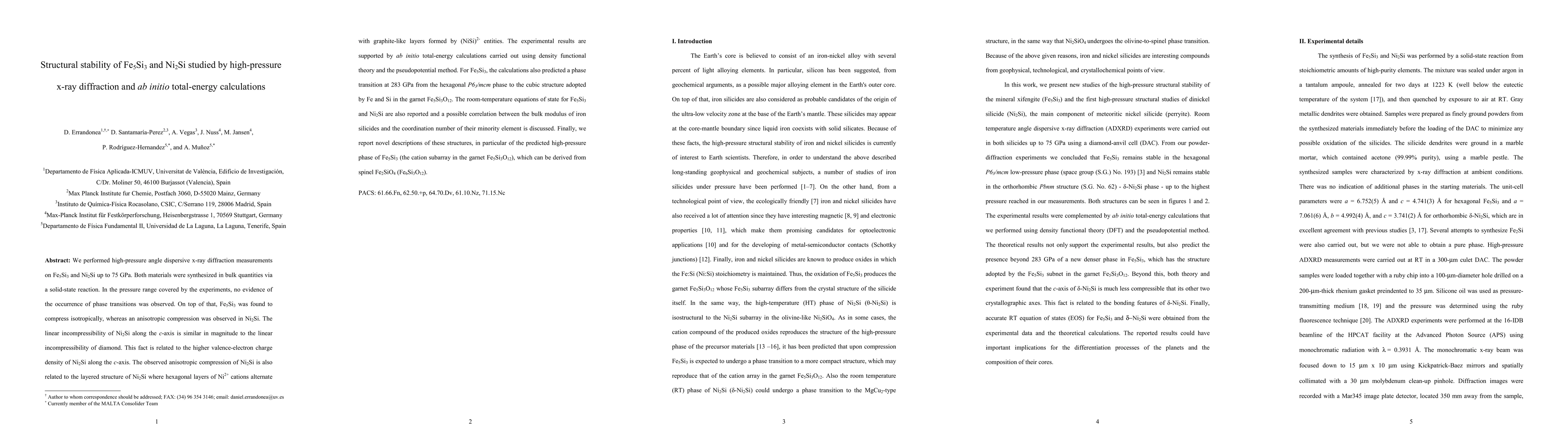 This study investigates the structural stability of Fe5Si3 and Ni2Si under high pressure using angle dispersive x-ray diffraction and ab initio calculations. No phase transitions were observed up to 75 GPa, with Fe5Si3 compressing isotropically and Ni2Si showing anisotropic compression due to its layered structure. Ab initio calculations support these findings and predict a phase transition in Fe5Si3 at 283 GPa.