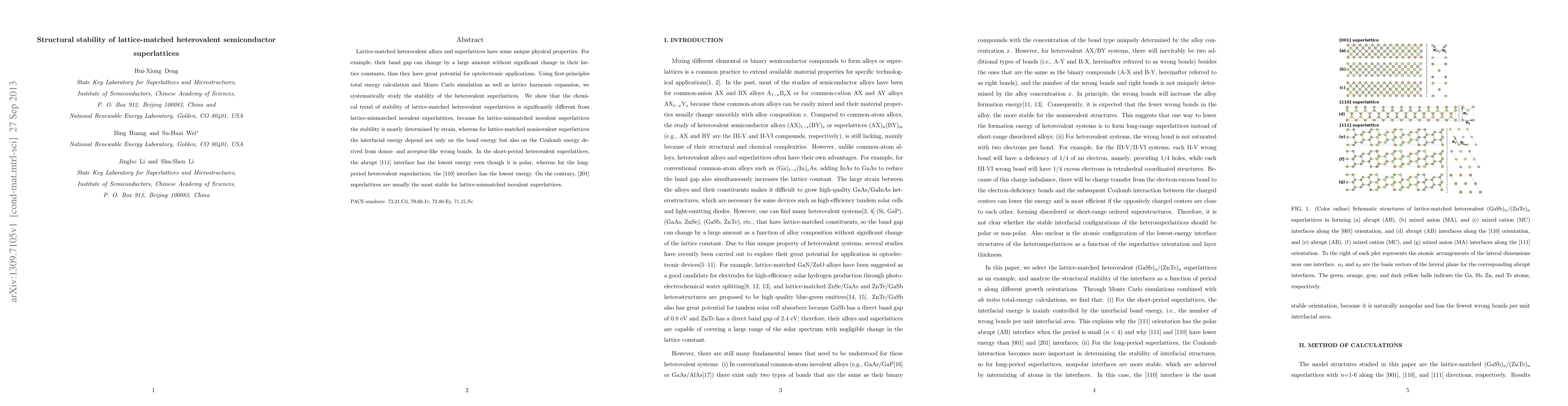 This paper investigates the structural stability of lattice-matched heterovalent semiconductor superlattices using first-principles calculations and simulations. It finds that the stability of these superlattices is influenced by both bond and Coulomb energies, differing from the strain-dominated stability of lattice-mismatched isovalent superlattices.