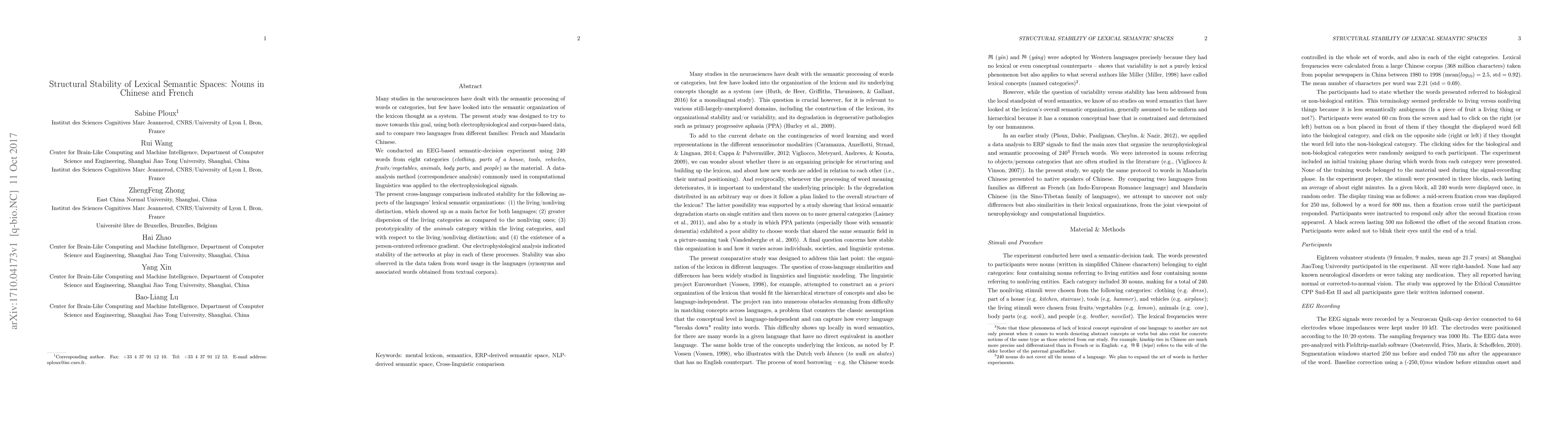Many studies in the neurosciences have dealt with the semantic processing of words or categories, but few have looked into the semantic organization of the lexicon thought as a system. The present study was designed to try to move towards this goal, using both electrophysiological and corpus-based data, and to compare two languages from different families: French and Mandarin Chinese. We conducted an EEG-based semantic-decision experiment using 240 words from eight categories (clothing, parts of a house, tools, vehicles, fruits/vegetables, animals, body parts, and people) as the material. A data-analysis method (correspondence analysis) commonly used in computational linguistics was applied to the electrophysiological signals. The present cross-language comparison indicated stability for the following aspects of the languages' lexical semantic organizations: (1) the living/nonliving distinction, which showed up as a main factor for both languages; (2) greater dispersion of the living categories as compared to the nonliving ones; (3) prototypicality of the \emph{animals} category within the living categories, and with respect to the living/nonliving distinction; and (4) the existence of a person-centered reference gradient. Our electrophysiological analysis indicated stability of the networks at play in each of these processes. Stability was also observed in the data taken from word usage in the languages (synonyms and associated words obtained from textual corpora).