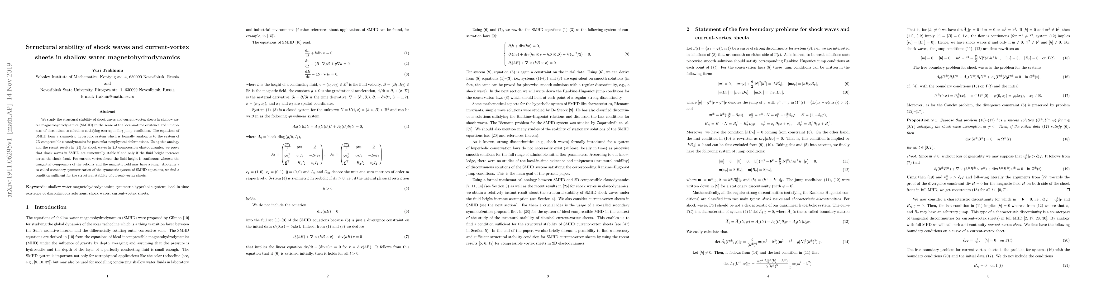This paper investigates the structural stability of shock waves and current-vortex sheets in shallow water magnetohydrodynamics, proving that shock waves are stable if fluid height increases across the shock front. For current-vortex sheets, a secondary symmetrization method is used to establish a condition sufficient for their stability.