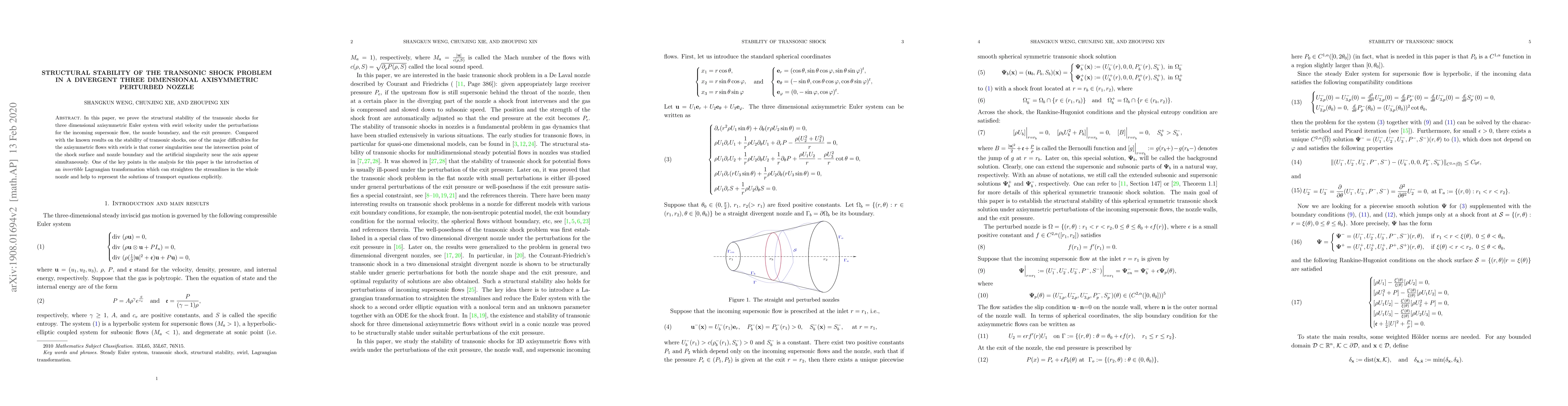 This paper proves the structural stability of transonic shocks in three-dimensional axisymmetric Euler systems with swirl under perturbations. It introduces an invertible Lagrangian transformation to straighten streamlines and explicitly represent transport equation solutions, addressing the challenges of corner singularities and artificial singularities.