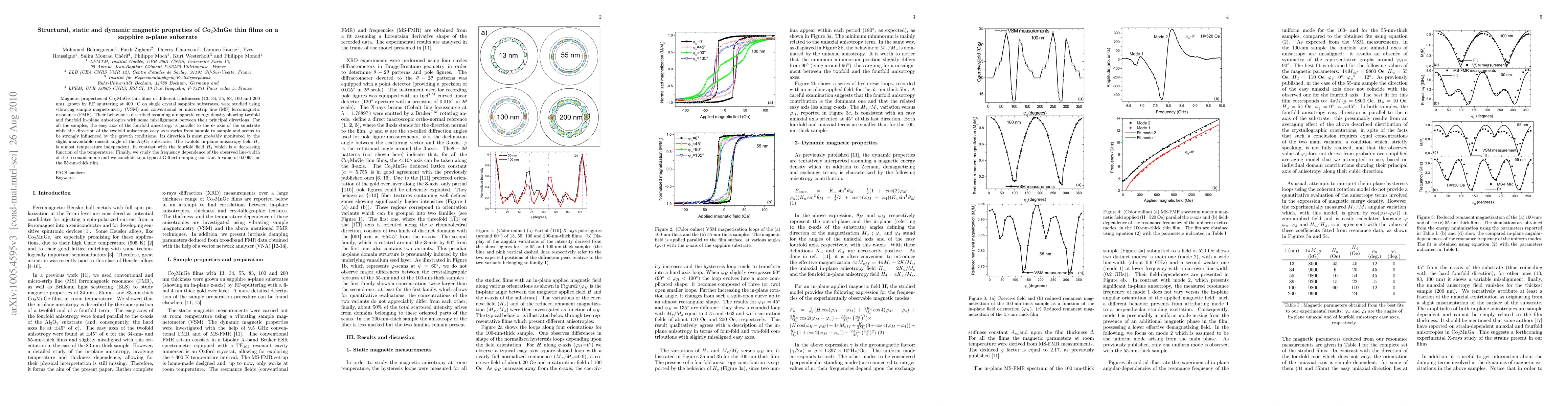 Magnetic properties of CoMnGe thin films of different thicknesses (13, 34, 55, 83, 100 and 200 nm), grown by RF sputtering at 400{\deg}C on single crystal sapphire substrates, were studied using vibrating sample magnetometry (VSM) and conventional or micro-strip line (MS) ferromagnetic resonance (FMR). Their behavior is described assuming a magnetic energy density showing twofold and fourfold in-plane anisotropies with some misalignment between their principal directions. For all the samples, the easy axis of the fourfold anisotropy is parallel to the c-axis of the substrate while the direction of the twofold anisotropy easy axis varies from sample to sample and seems to be strongly influenced by the growth conditions. Its direction is most probably monitored by the slight unavoidable angle of miscut the Al2O3 substrate. The twofold in-plane anisotropy field is almost temperature independent, in contrast with the fourfold field which is a decreasing function of the temperature. Finally, we study the frequency dependence of the observed line-width of the resonant mode and we conclude to a typical Gilbert damping constant of 0.0065 for the 55-nm-thick film.