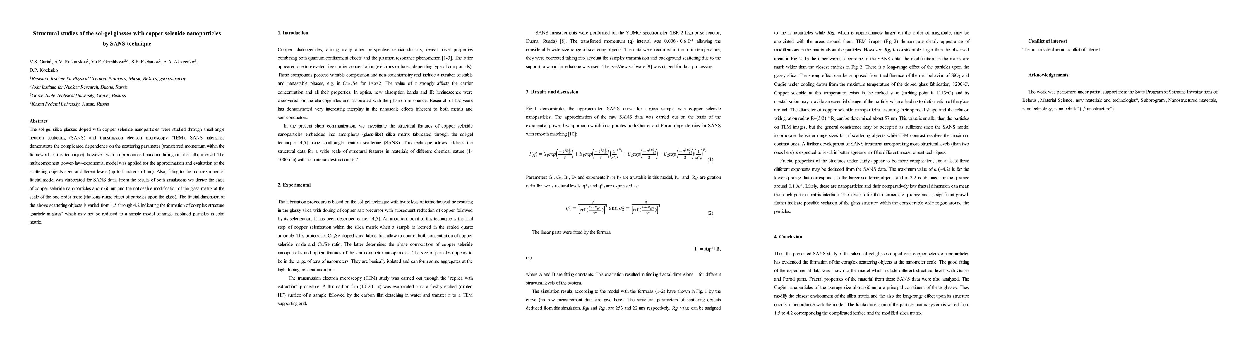 This study uses small-angle neutron scattering (SANS) and transmission electron microscopy to investigate sol-gel silica glasses doped with copper selenide nanoparticles. The SANS data reveals no pronounced peaks, but the multi-component power-law-exponential model and mono-exponential fractal model suggest Cu2Se particle sizes around 60nm and a complex particle-in-glass structure.