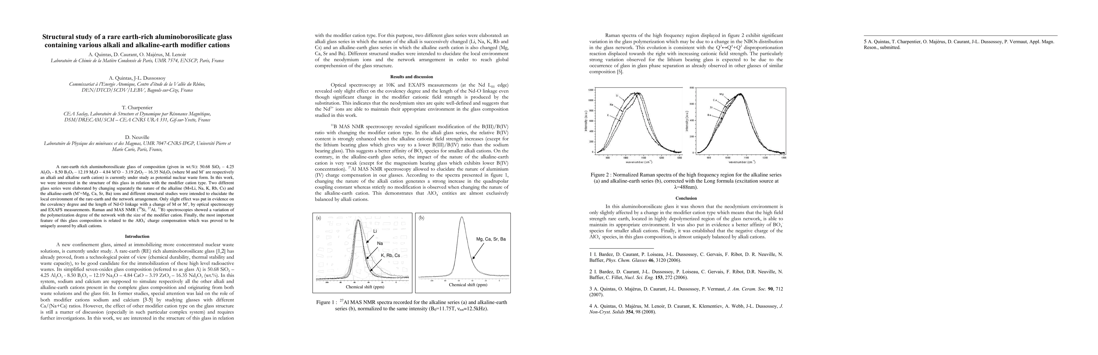 A rare-earth rich aluminoborosilicate glass of composition (given in wt.%): 50.68 SiO2 - 4.25 Al2O3 - 8.50 B2O3 - 12.19 M2O - 4.84 M'O - 3.19 ZrO2 - 16.35 Nd2O3 (where M and M' are respectively an alkali and alkaline earth cation) is currently under study as potential nuclear waste form. In this work, we were interested in the structure of this glass in relation with the modifier cation type. Two different glass series were elaborated by changing separately the nature of the alkaline (M=Li, Na, K, Rb, Cs) and the alkaline-earth (M'=Mg, Ca, Sr, Ba) ions and different structural studies were intended to elucidate the local environment of the rare-earth and the network arrangement. Only slight effect was put in evidence on the covalency degree and the length of Nd-O linkage with a change of M or M', by optical spectroscopy and EXAFS measurements. Raman and MAS NMR (29Si, 27Al, 11B) spectroscopies showed a variation of the polymerization degree of the network with the size of the modifier cation. Finally, the most important feature of this glass composition is related to the AlO4- charge compensation which was proved to be uniquely assured by alkali cations.