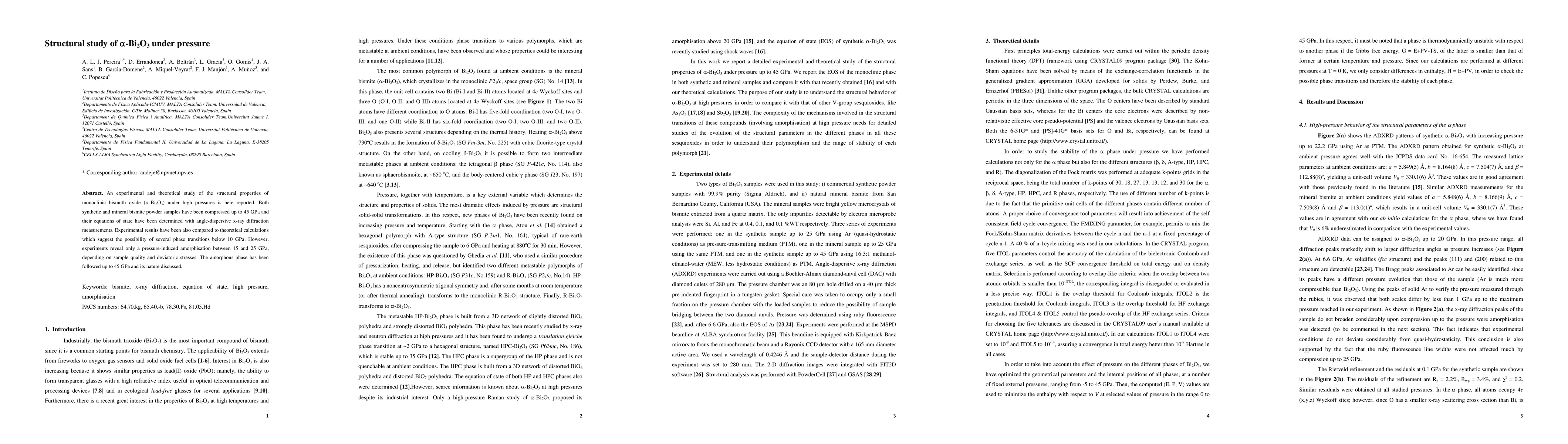 An experimental and theoretical study of the structural properties of monoclinic bismuth oxide (alfa-Bi2O3) under high pressures is here reported. Both synthetic and mineral bismite powder samples have been compressed up to 45 GPa and their equations of state have been determined with angle-dispersive x-ray diffraction measurements. Experimental results have been also compared to theoretical calculations which suggest the possibility of several phase transitions below 10 GPa. However, experiments reveal only a pressure-induced amorphisation between 15 and 25 GPa, depending on sample quality and deviatoric stresses. The amorphous phase has been followed up to 45 GPa and its nature discussed.